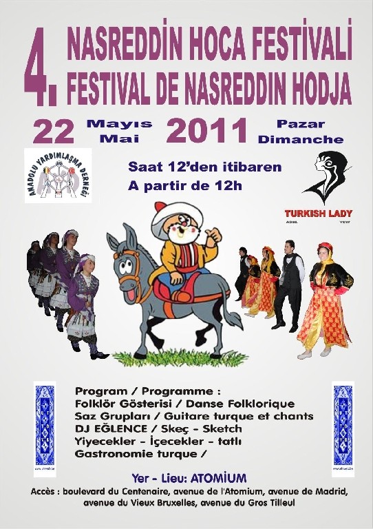 4.Gerçekleştirilecek olan Nasreddin Hoca Şenlikleri´nin, Brüksel´in ünlü Atomium parkında gerçekleştirileceği öğrenildi. Şenliklerin saat 12.00 den itibaren gerçekleştirilmesi öngörülüyor. 22 Mayıs 2001 Pazar günü,Atomium parkında gerçekleştirilecek olan etkinliklere girişin ücretsiz olduğu öğrenildi.