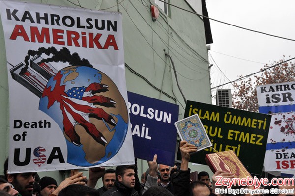 Halkalı Zeynebiye Camii'nde kılınan öğle namazının ardından Zeynebiye Caddesi'nde toplanan kalabalık; "İslam ümmeti kabul etmez zilleti, Kahralsun ABD Kahrolsun İsrail, İslam Ümmeti Kuran'a sahip çık, Kuran yoluna bin canımız feda, Şii-Sünni kardeştir, ayrım yapan kalleştir" sloganları attılar.