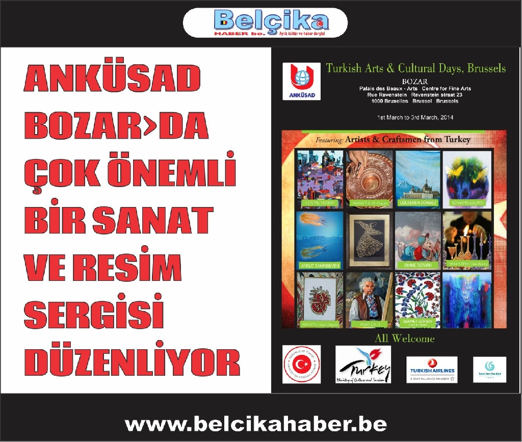 Başkanlığını Necati Yılmazkaya’nın yaptığı ANKÜSAD (Anadolu Uluslararası Kültür Sanat Derneği) tarafından bir çok sanatçının katılımıyla gerçekleştirilecek Türk Kültür ve Sanat Günleri çerçevesinde Bozar’da 1-3 Mart 2014tarihleri arasında Türk sanatçıların resim ve el sanatları eserleri sergilenecek.