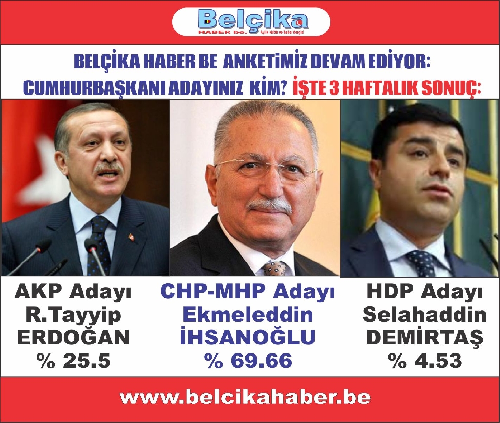 Belçika'nın en çok izlenen haber sitesi 'Belçika Haber Be. olarak Cumhurbaşkanlığı seçiminde oyunuzu hangi adaya vereceksiniz' başlıklı bir anket düzenledik. Belçika haber be okurlarına yönelik olacak olan bu anket, 08-08-2014 gününe kadar devam edecektir.