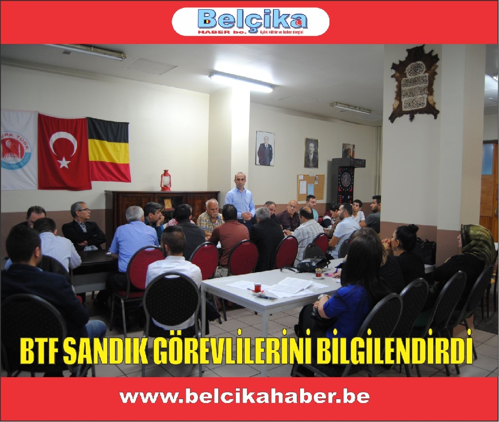 Kısa adı BTF olan Belçika Türk Federasyonu Cumhurbaşkanlığı seçimlerinde 'sandık başı ve sandık koruma görevlileri' ile dernek lokalinde son istişare toplantısı gerçekleştirdi. BTF Genel Başkanı Ömer Zararsız'ın başkanlık ettiği toplantıda Belçika genelindeki 50'ye yakın görevli hazır bulundu.