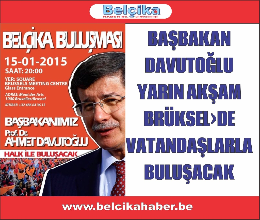 T. C. Başbakanı Prof. Dr. Ahmet davutoğlu 15 Ocak 2015 perşembe günü saat 20:00'de Mont des Arts 1000 Brüksel'de adresinde bulunan 'Square Brussel Meeting Centre' vatandaşlarla buluşacak.