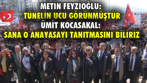 Bu sırada Cumhurbaşkanı Recep Tayyip Erdoğan'la polemik yaşayan İstanbul Baro Başkanı Ümit Kocasakal da, 'Ey baro başkanı' diye anons edildi. Kocasakal bu sırada, büyük alkış aldı. Mitingin açılış konuşmasını İzmir Baro Başkanı Aydın Özcan, yaptı. Özgürlüğün bağımsızlığın kenti İzmir'den herkesi selamladığını söyleyen Aydın Özcan, "İç güvenlik yasası, yasalaşırsa ülkede hukuk kalmaz dedik. Yasayı geri çekin dedik. Ama dinletemedik. Bütün baro başkanı arkadaşlarımız, hangi siyasi görüşte olursa olsun hepsi bildiriyle imza attı. Siyasileri uyardık, ama gelin görün ki kendimizi dinletemedik. Bildiklerini okudular. 31 Mart'ta Türkiye karanlığa büründü. Çağlayan üzücü olaya sahne oldu. Cumhuriyet Savcımız, önce rehin alındı, sonra katledildi. Büyük üzüntü çektik. Yetkililer bu cinayeti aydınlatacaklarına yeni bir hedef buldular o da avukatlar, hukukçular oldu. Biz bunu asla kabul etmiyoruz ve onun için bu meydanlardayız. Bizler savunmanın örgütlü güçleri olarak hukukçuları olarak bu hukuksuzluğa asla meydan vermeyeceğiz. İzin vermeyeceğiz. Mücadelemizi sonuna kadar sürdüreceğiz. Yılmayacağız. Bizim bağımsızlığımıza Hasan Tahsin önderlik etti. İzmir'deki Mustafa Kemal ruhu hiçbirir zaman pes etmez. Mustafa Kemal'in ruhuyla sokaklarda olacağız" dedi.