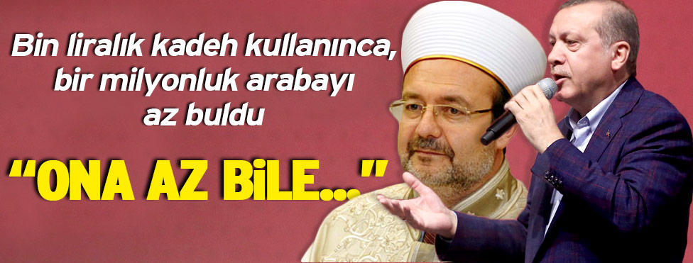 Cumhurbaşkanı Tayyip Erdoğan, Diyanet İşleri Başkanı Mehmet Görmez’in, 1 milyon TL’lik makam aracı için, “İbret-i alem olsun diye o aracı iade edeceğiz” sözlerine “Kusura bakmasın Diyanet İşleri Başkanım, eğer benim haberim olsa ben derdim ki, sakın bu arabayı verme” diyerek yanıt verdi.