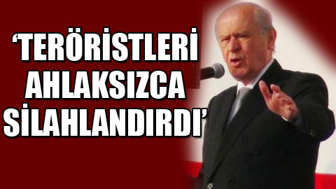 Hükümet’in, komşu coğrafyalardaki kanlı boğuşmaya hangi yasal ve ahlaki mazeretlere dayanarak silah sevkiyatı yaptığını soran Bahçeli, “Komşu coğrafyalardaki iç savaşa taraf olan, teröristleri, isyancıları ahlaksızca silahlandıran Erdoğan ve Davutoğlu vatana, millete ve devlete ihanet etmiş olmayacak mıdır? Erdoğan 1,5 yıldır Türk milletini kandırmıştır. Davutoğlu 1,5 yıldır gerçekleri çarpıtmış, teröristleri silahlandırmıştır” dedi.
