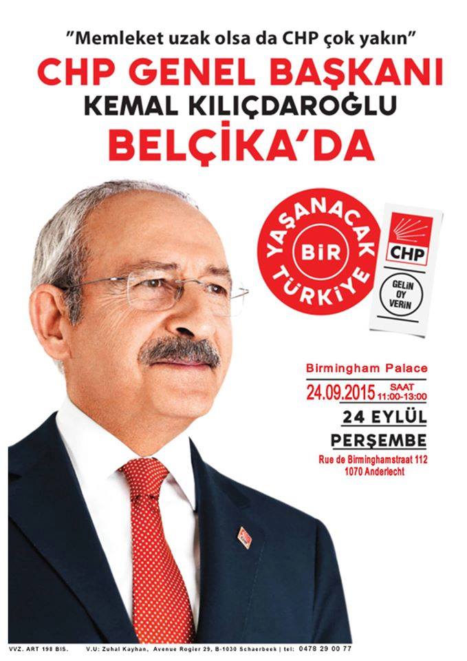 Genel Başkanımız Sayın Kılıçdaroğlu, 24 Eylül 2015 Perşembe (Kurban bayramının birinci günü) nedeniyle, Birminghamstraat 112, 1070 Anderlecht adresinde bulunan ‘Birmingham Palace’de saat : 12:00-14:00 arası Belçikalı Türk vatandaşlarla bayramlaşacaktır.