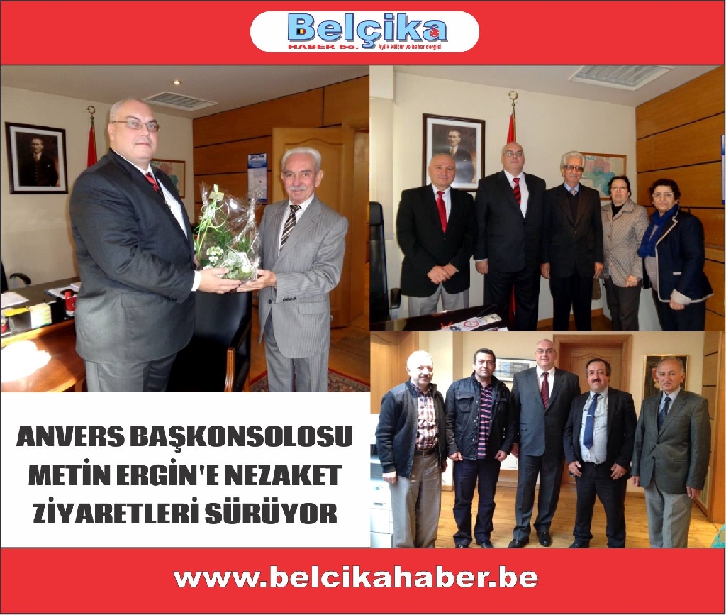 Kanal Avrupa Televizyonu program yapımcısı ve Gündem Be. Genel Yayın Yönetmeni Hüseyin Dönmez, Beringen Müzik Kulübü Başkanı İsmail Erdoğdu, Anvers Zuid Mehmet Akif kültür Merkezi ve Camii Dernek Başkanı Hüseyin Ulusoy , Başkan Yardımcısı Bahattin Çelik, Başkan yardımcısı Ali Keklik ve Mehmet Akif Camii İmamı Şevki Kaya Anvers Başkonsolosu Metin Ergin’i ziyaret ederek, yeni görevinde başarı dileklerinde bulundular.