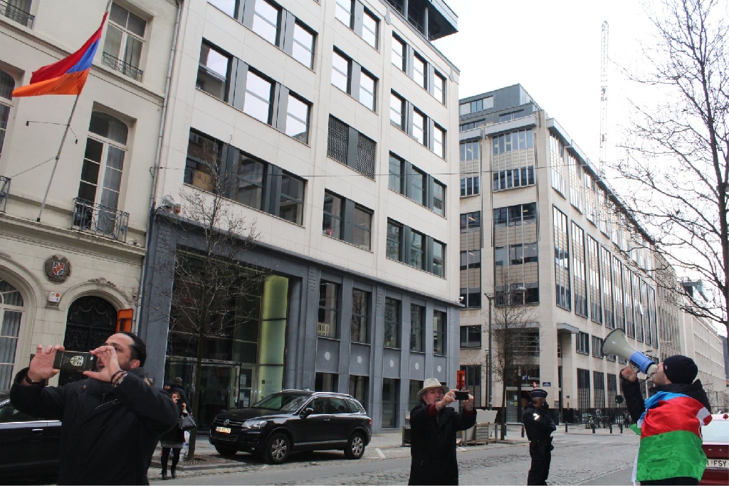 Gösteri sonrası Ermenistan Cumhuriyeti’nin Brüksel Büyükelçiliği önüne gelen yüzü aşkın dernek ve birlik temsilcileri toplu bir şekilde burada Azerbaycan Milli Marşı’nı okuyup, şehitler için bir dakikalık saygı duruşunda bulundular. Ellerindeki Azerbaycan ve Türk dünyası bayrakları ve katliam posterleriyle gösteriye katılanlar, hep birlikte İngilizce, Fransızca ve Flamanca sloganlar atarak ‘Hocalı’ya Adalet’, ‘Hepimiz Türküz’, ‘Hepimiz Karabağlıyız’, ‘Hepimiz Hocalıyız’, ‘Katil Ermenistan’, ‘Katil Sarkisyan’ diye sloganlar atarak, Hocalı şehitlerini andılar. İzin alınarak yapılan Yürüyüş ve gösteri olaysız bir şekilde son buldu.