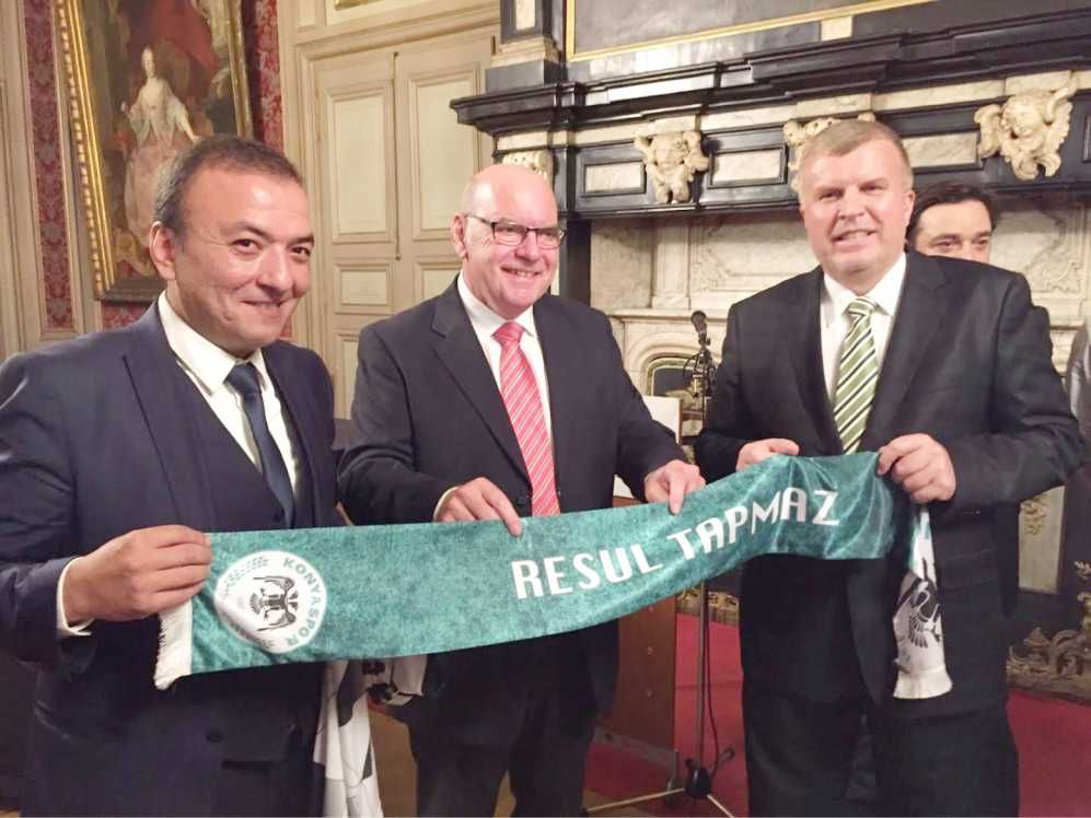 Gent Büyükşehir Belediye Başkan Yardımcısı. Resul Tapmaz, Belediye Başkanı Daniël Termont ile birlikte Atiker Konyaspor Başkanı Ahmet Şan, Teknik direktör Aykut Kocaman ve Yönetim Kurulu üyelerini Belediye sarayında karşıladı.