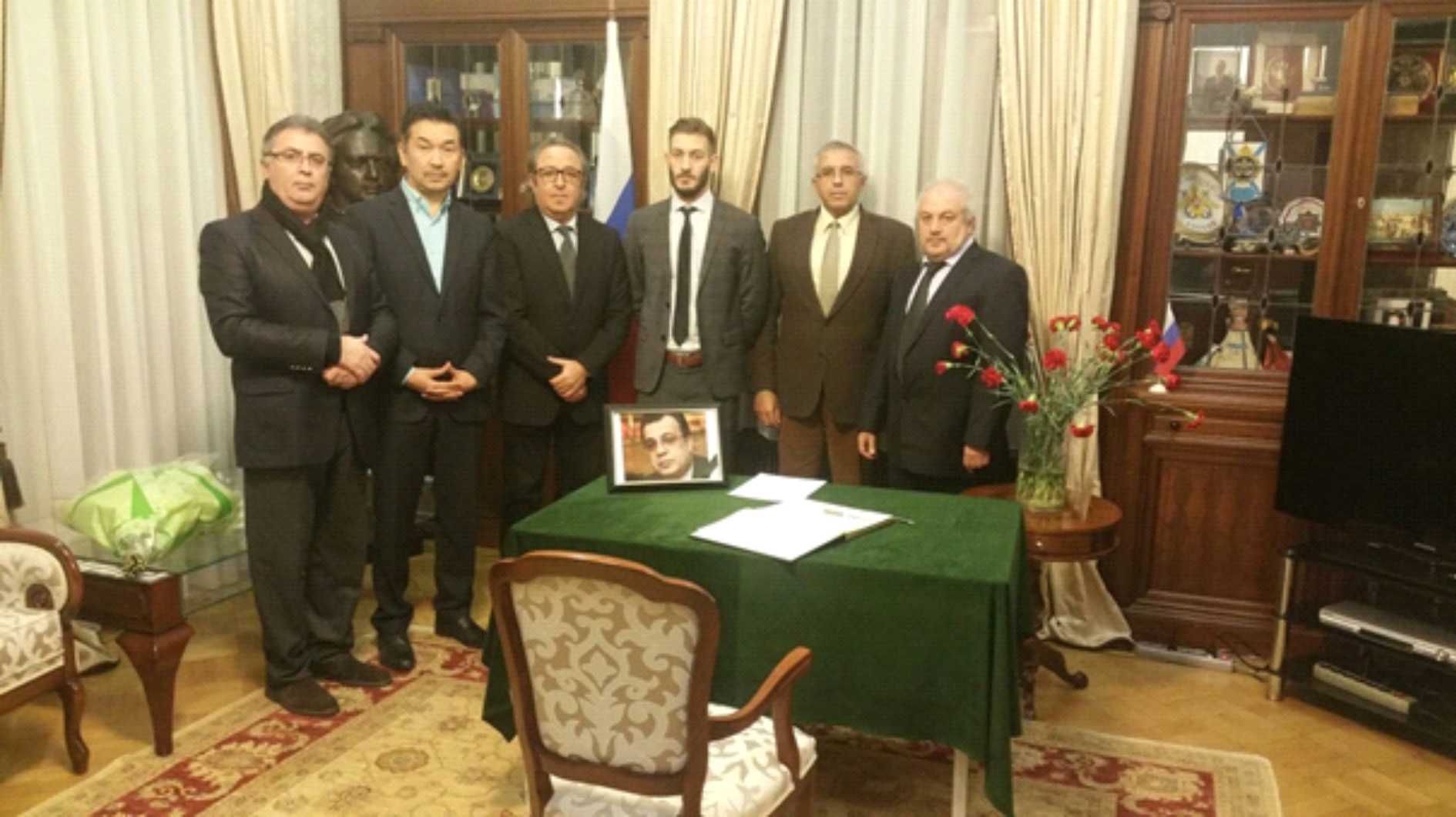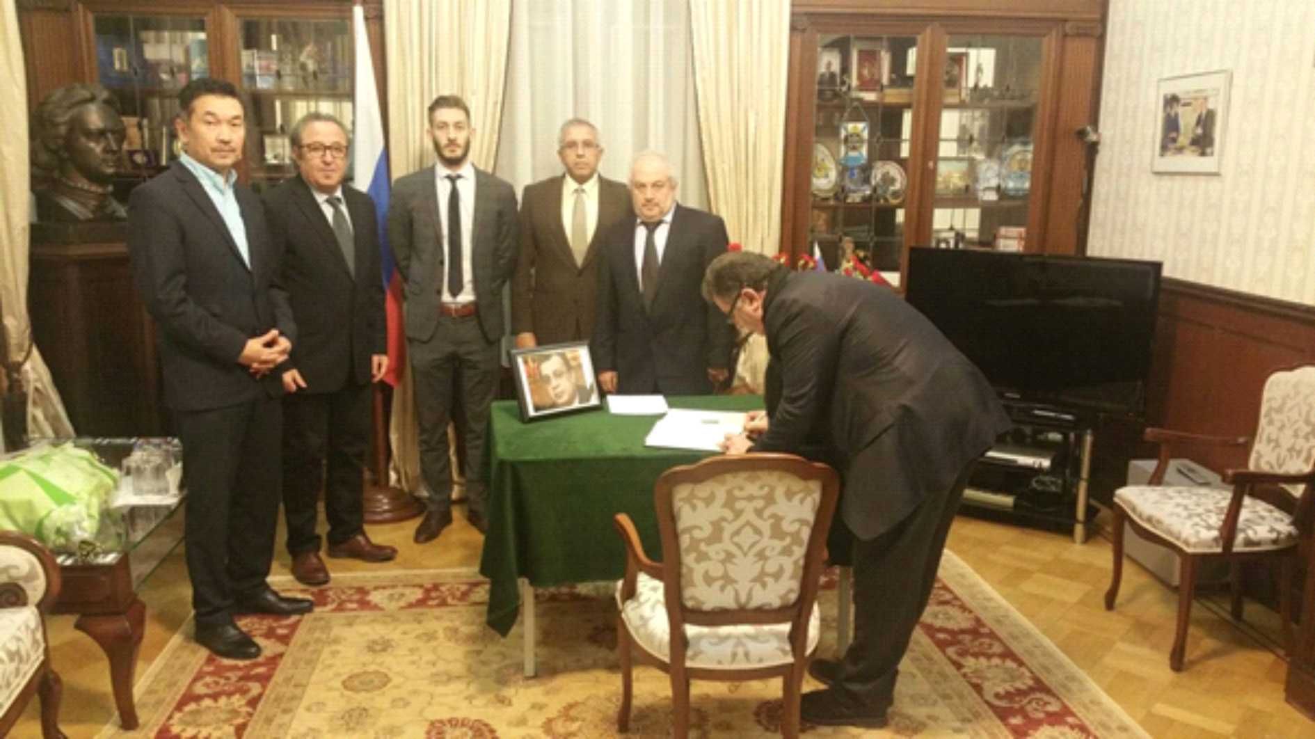 Fotoğraflarda: Lahey’deki Rusya Büyükelçiliğini taziye için ziyaret eden Türkler’i, Rus Ataşesi Anton Naunkin (sağdan üçüncü) karşıladı. Türkler taziye defterine de duygularını yazdılar.