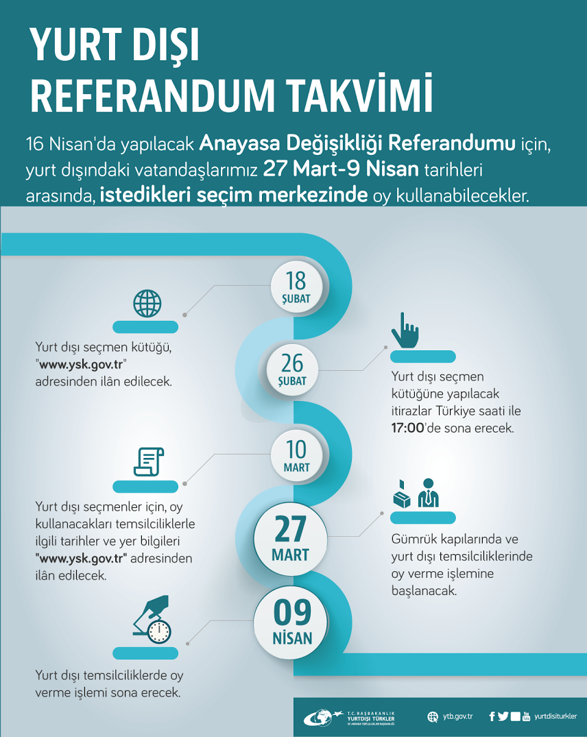 Yurt dışında yaşayan vatandaşlarımız için halkoylaması takvimi belli oldu. 16 Nisan'da yapılacak Anayasa Değişikliği Halkoylaması için yurt dışındaki vatandaşlarımız gümrük kapılarında 27 Mart-16 Nisan, yurt dışında 27 Mart-9 Nisan tarihleri arasında oy kullanabilecek.