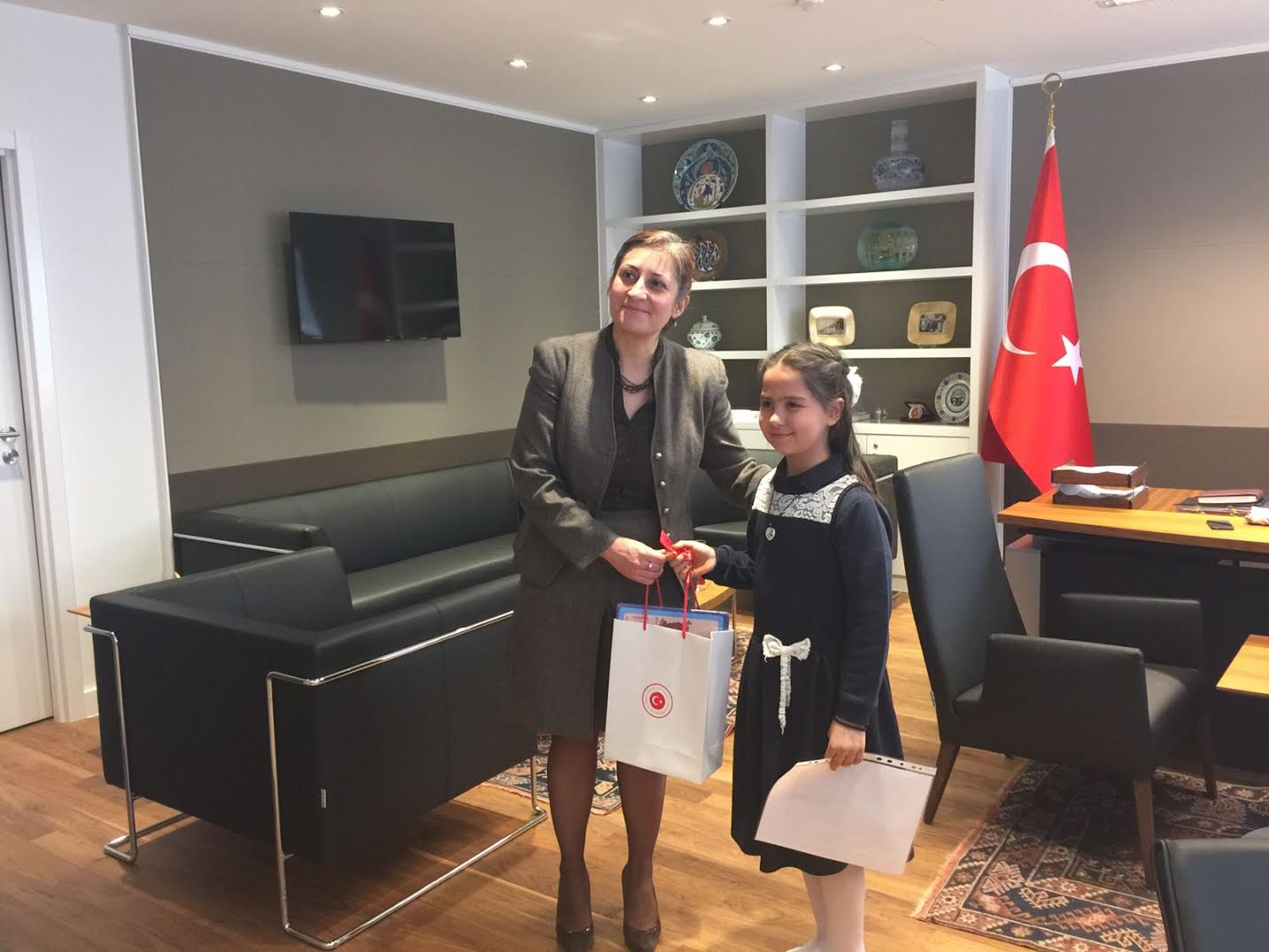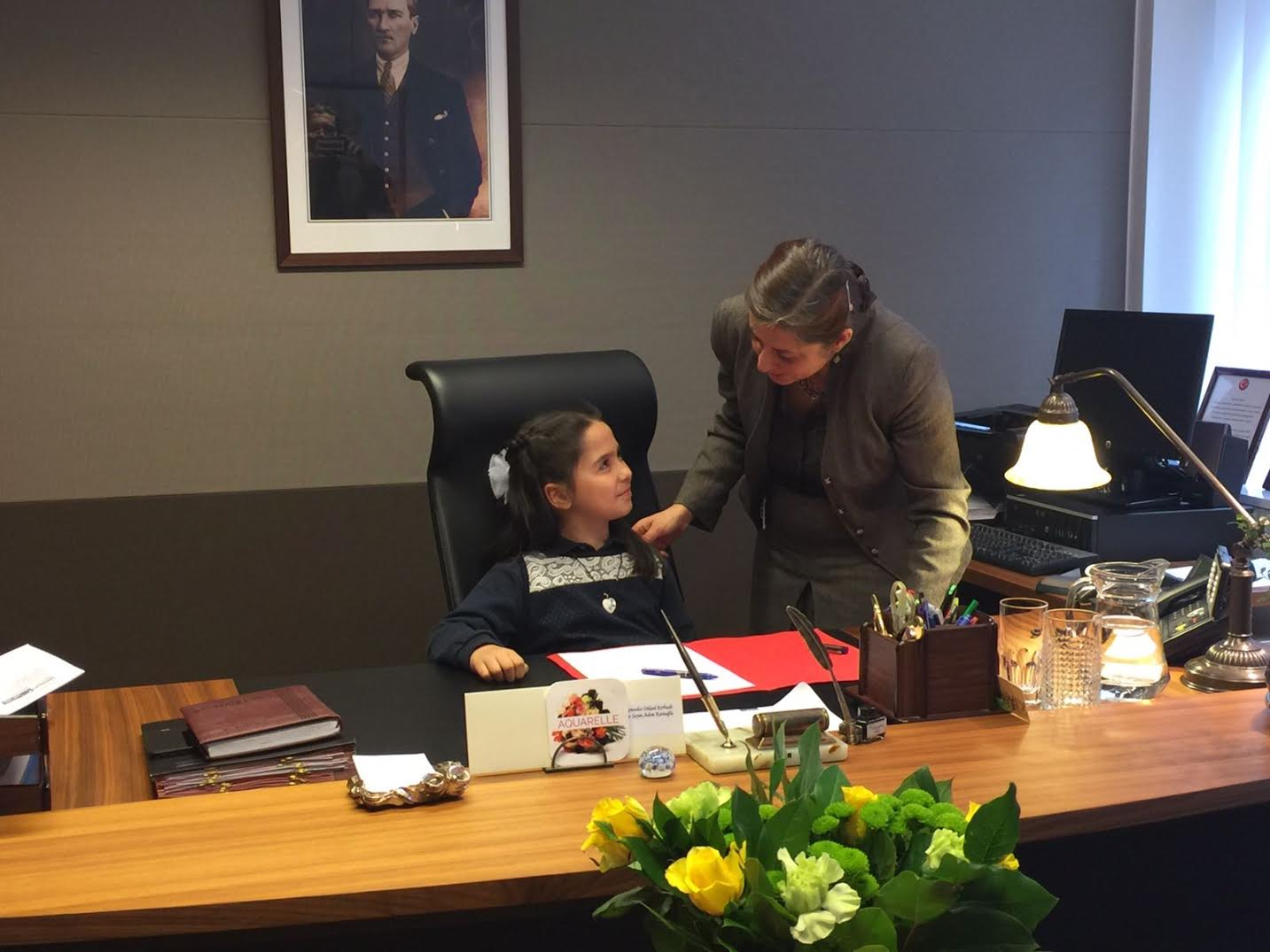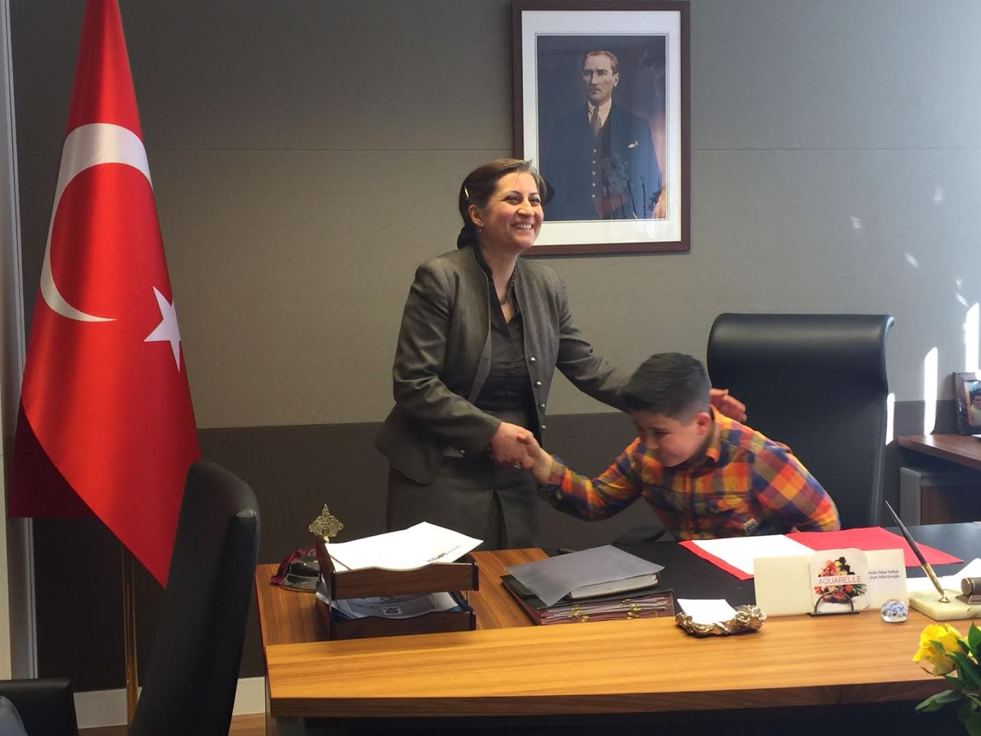 Türk Dili ve Kültürü öğretmenlerinden Fatma Sancaktutan’ın eşlik ettiği Süeda Mirmir (8 yaşında) ve Nurullah Üstünsoy (11 yaşında), Başkonsolos Dilşad Kırbaşlı Karaoğlu'nun koltuğunu bir süre devraldı.