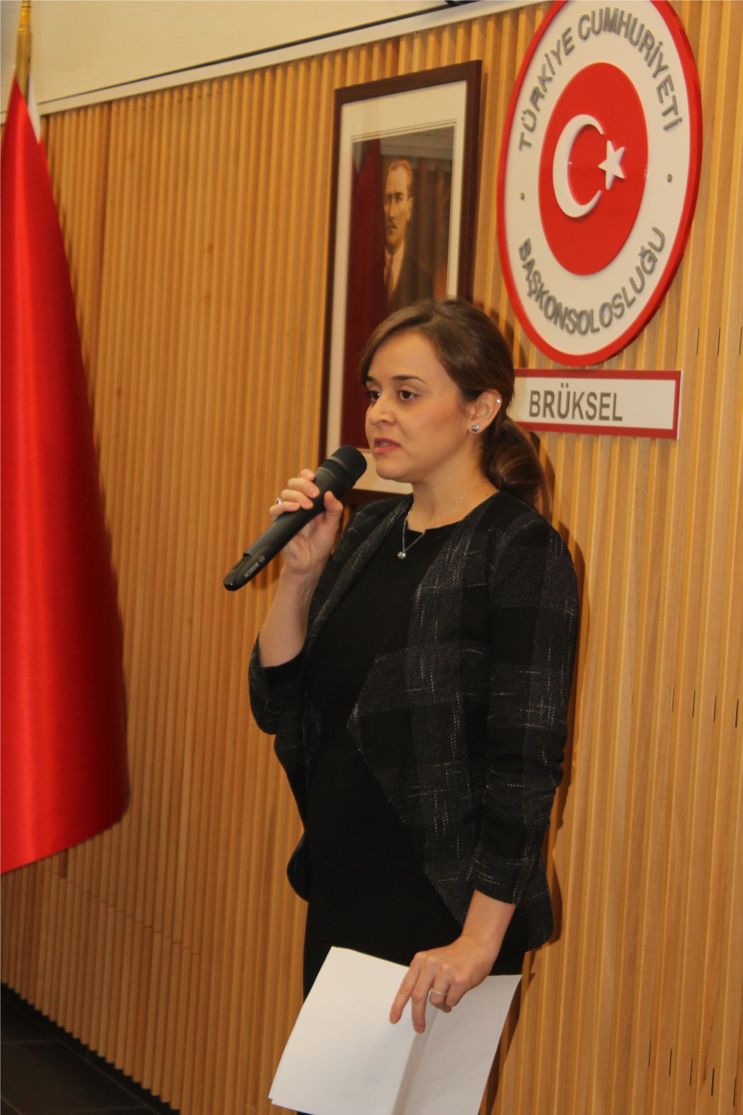 Brüksel Başkonsolosu Dilşad Kırbaşlı Karaoğlu yaptığı konuşmada "Değerli vatandaşlarımız, Bugün Cumhuriyetimizin kurucusu Mustafa Kemal Atatürk'ün ebediyete intikalinin 79, yıldönümünü sizlerle birlikte anıyoruz. Her 10 kasım saat 09'u 5 geçe tüm ülkemiz ve dış temsilciliklerimizde adeta hayat durmakta. Bir asıra yaklaşan ayrılığında bugün bile bizleri milyonları bir araya getiren ayrılığında bile bizler onun manevi huzurunda birlik içerisinde olabilmekteyiz. Tüm Türk halkı bu saatte Atamız ve arkadaşlarının aziz hatıraları önünde eğilmekte ve saygı duymaktalar.