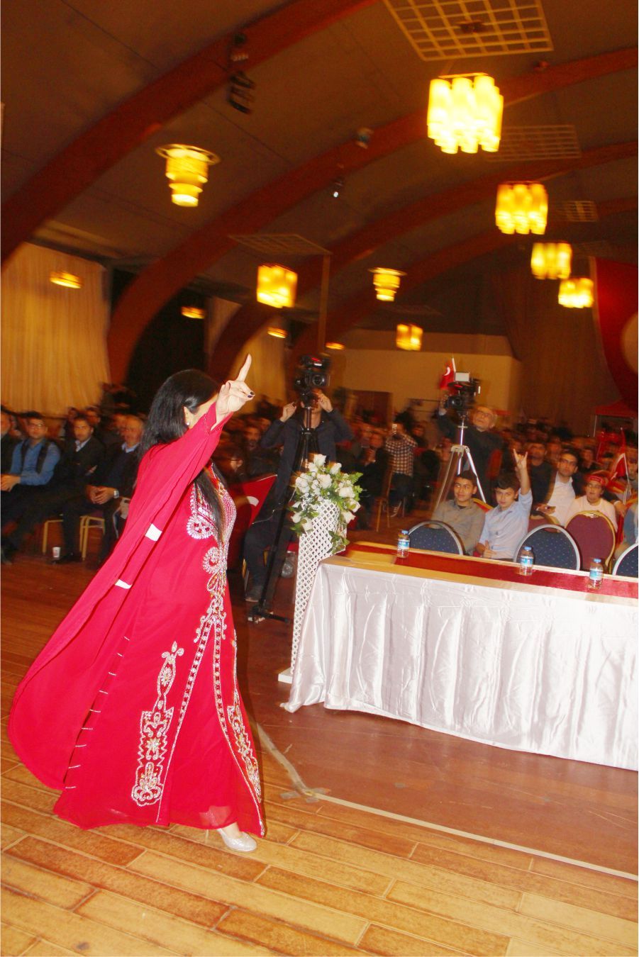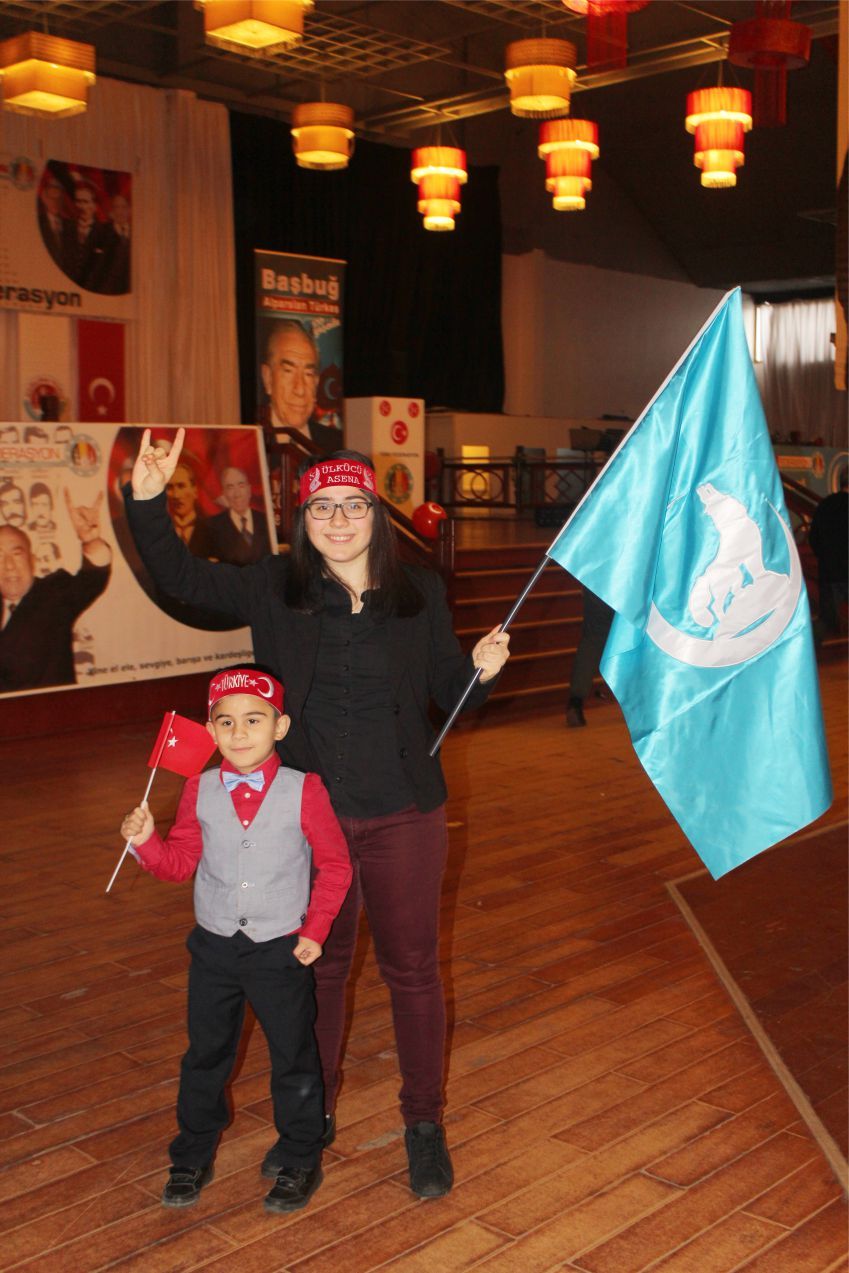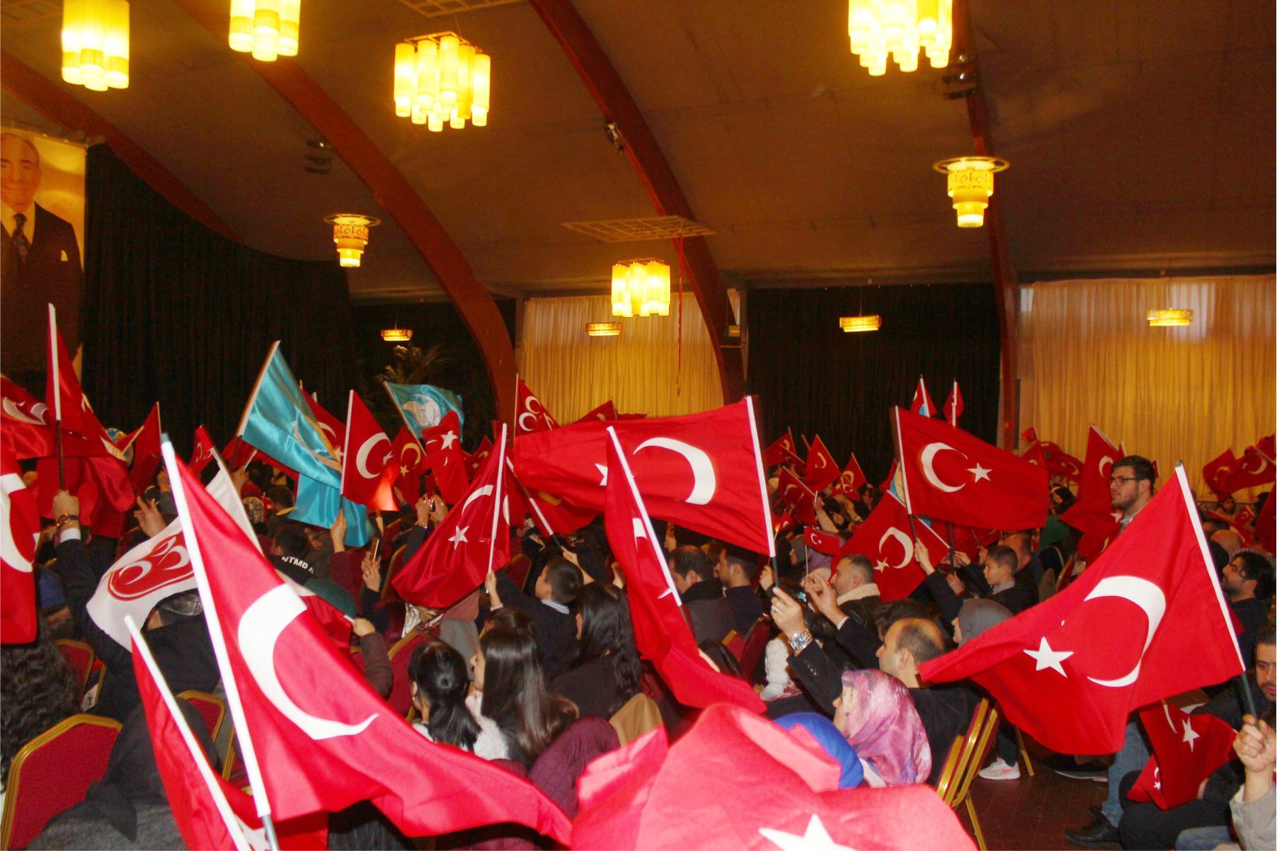 Program davetli ve protokol üyelerinin yerlerini almasının ardından Belçika ve Türk marşlarının okunması, şehitlere saygı duruşu ile başladı. Atatürk, Türkeş ve MHP genel başkanı Devlet Bahçeli’nin posterleri, Türk ve parti bayraklarıyla donanan salonda ülkücüler sık sık ‘Başbuğ Türkeş, Lider Bahçeli’, ‘Ülkücü Hareket Engellenemez’ şeklinde sloganlar atarak, ellerindeki bayraklarla sanatçılara eşlik ettiler.