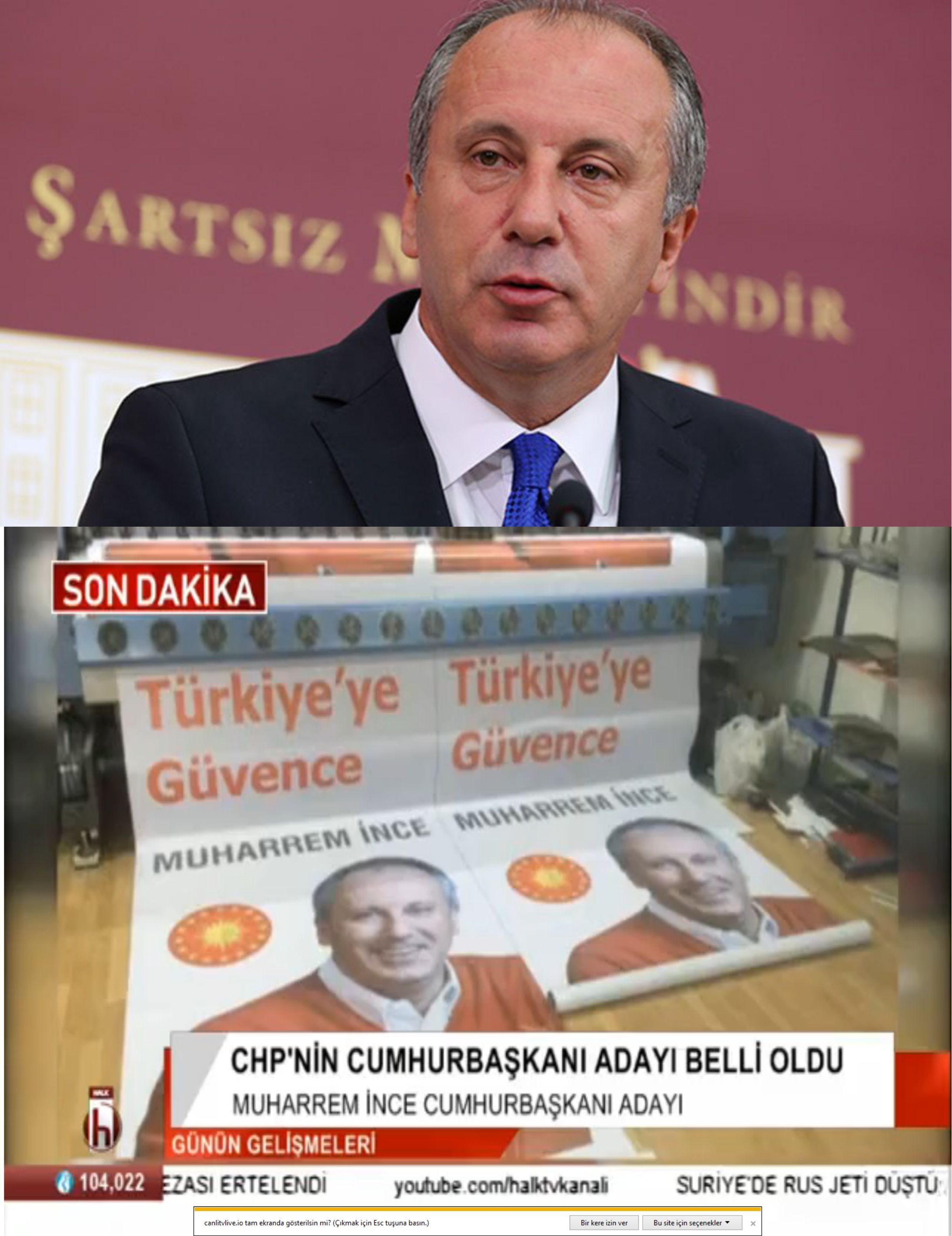 CHP'SİNİN ADAYI YALOVA MİLLETVEKİLİ MUHARREM İNCE OLDU CHP genel başkanı Kemal Kılıçdaroğlu yarın Muharrem İnce'nin CHP'nin Cumhurbaşkanı adaylığını Ahmet taner Kışlalı salonunda büyük bir gövde gösterisiyle resmen ilan edilecek.