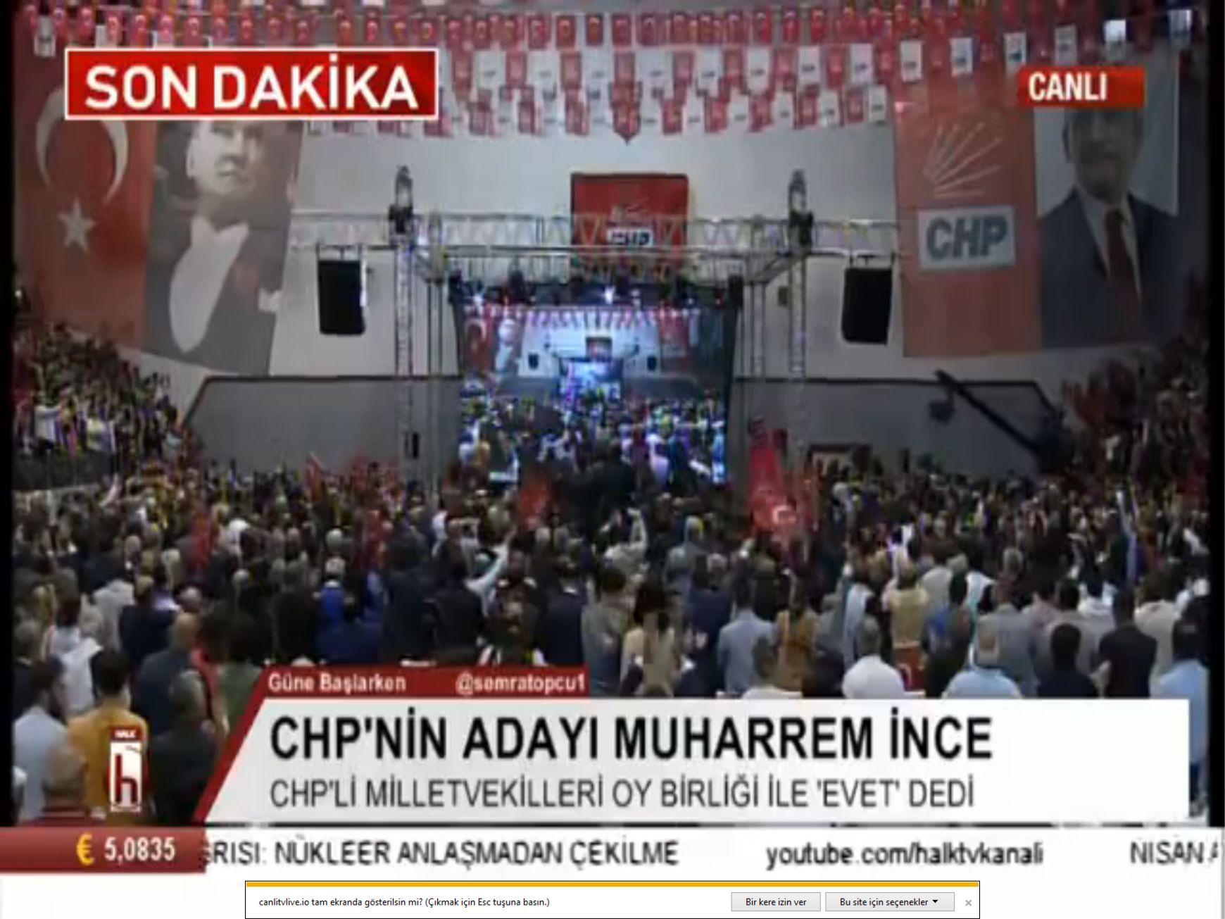 ~~CHP Genel Başkanı Kemal Kılıçdaroğlu, Ahmet Taner Kışlalı Spor Salonu'nda gerçekleşecek 'Büyük Buluşma'da, partisinin cumhurbaşkanı adayını açıklayacak. Muharrem İnce'nin CHP adayı olarak açıklanması bekleniyor. Sabah saatlerinde ailesiyle olan fotoğrafını twitter'dan paylaşan İnce "Biz hazırız" dedi.