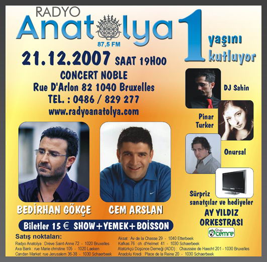 Başkent Brüksel´de Türkçe lezzette, Türkçe programlar yapan Radyo Anatolya´nın 1.yaş günü hazırlıkları sürüyor. Radyo Anatolya´nın sahibi Ramazan Kurt;´ Başkent Brüksel´de daha önceleri ´FM Türk´ adı ile yaptığımız Türkçe yayınları artık, kendi evimizden ve kendi antenlerimizden yapmanın mutluluğu içindeyiz. Bizimle birlikte özveri içinde çalışan arkadaşlarımız, güzel Türkçe programlar için çaba gösteriyor. Birbirinden renkli programlar yanında ´Best FM´ bağlantılı yayınlarımız da büyük ilgi görüyor. Kısacası Avrupa Birliği´nin başkenti Brüksel´de Türkçe yayın yapmanın dayanılmaz bir heyecanı ve gururu var. Birinci yaş günü etkinliğimiz 21 Aralık 2007 günü olacak. Bu aynı zamanda bir yılbaşı eğlencesi gibi algılanabilir. Rue D´Arlon 82-1000 Brüksel adresindeki salonda etkinliğimiz olacak. Bu mutlu günümüzde Best FM´in en güçlü ismi Cem Aslan ve daha önce Best FM´den tanıdığımız şair Bedirhan Gökçe ve kendi starlarımız Pınar Türker, Onursal Ayyıldız Orkestrası eşliğinde geceye renk katacaklar. Ayrıca genç DJ Şahin gecenini akışı içinde sevilen ve gündeme damga vuran şarkıları dinleyicilerimiz için olduğu kadar, konuklarımız için çalacak´diyerek, herkesi Radyo Anatolya´nın 1.Yaş gününe beklediğini söyledi. Brüksel´de FM kanal 87,5 frekansı üzerinden yayın yapan Radyo Anatolya´nın aynı zamanda ´www.radyoanatolya.com´ üzerinden de dinleme imkanı olduğunu belirten Kurt; isteyenler daha geniş bilgiyi vebsitemizden de edinebileceklerini söyledi.
