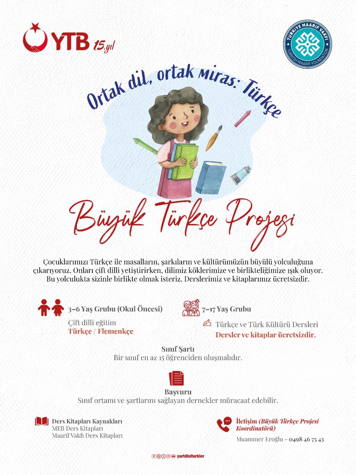 Yurtdışı Türkler ve Akraba Topluluklar Başkanlığı (YTB) öncülüğünde ve Türkiye Maarif Vakfı’nın eş finansmanıyla 2022 yılında başlatılan "Büyük Türkçe Projesi", Belçika’nın farklı bölgelerinde Türkçe’nin ve Türk kültürünün öğrenilmesi ve yaygınlaştırılması için büyük bir adım oldu. Proje, özellikle Belçika’da Milli Eğitim Bakanlığı’nın öğretmen gönderemediği bölgelerdeki ihtiyacı karşılamayı hedefliyor. "Ortak dil, ortak miras: Türkçe" sloganıyla yola çıkan proje kapsamında, çocuklarımızı Türkçe’nin büyülü dünyasıyla buluşturarak, çift dilli yetişmelerine ve kültürel kökleriyle bağlarını güçlendirmelerine katkı sağlanıyor. Ayrıca 3-6 yaş grubu için Türkçe/Flemenkçe çift dilli eğitim modeliyle; çift dilli eğitimin akademik başarıya olan olumlu etkisini ön plana çıkaran akademik külliyatı hayata geçiriyor!
