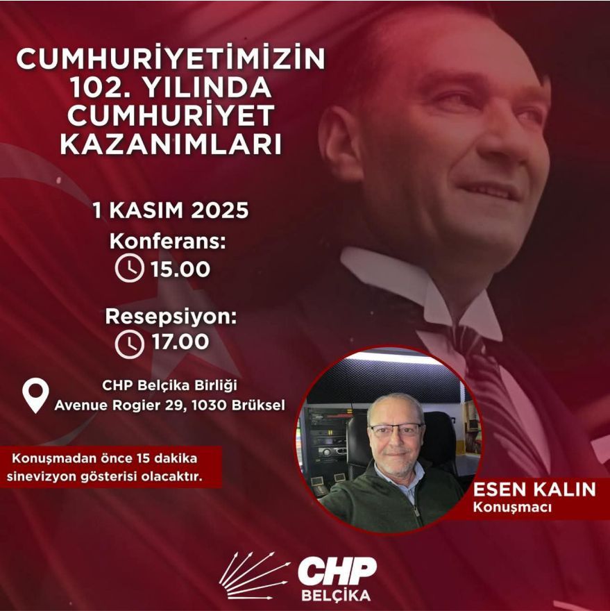CHP Belçika Birliği Başkanı Bulduk, “Cumhuriyetimizin 102. Yılı ve ’29 Ekim Cumhuriyet Bayramı’ etkinlikleri çerçevesinde her yıl geleneksel olarak kutladığımız Cumhuriyet Bayramı’nın bu yılki etkinliğimizde Atatürkçü ve Cumhuriyet değerlerini savunan değerli Gold FM Progran yapımcısı Sayın Esen Kalın’ın ağırlamaktan dolayı mutluyuz. Güzel bir konferans olacağına inanıyor, bizler her zaman Atatürk’ü fikirleriyle ve kurduğu Cumhuriyet’in değerlerine her türlü baskı ve zulme karşı savunmaya devam edeceğiz.