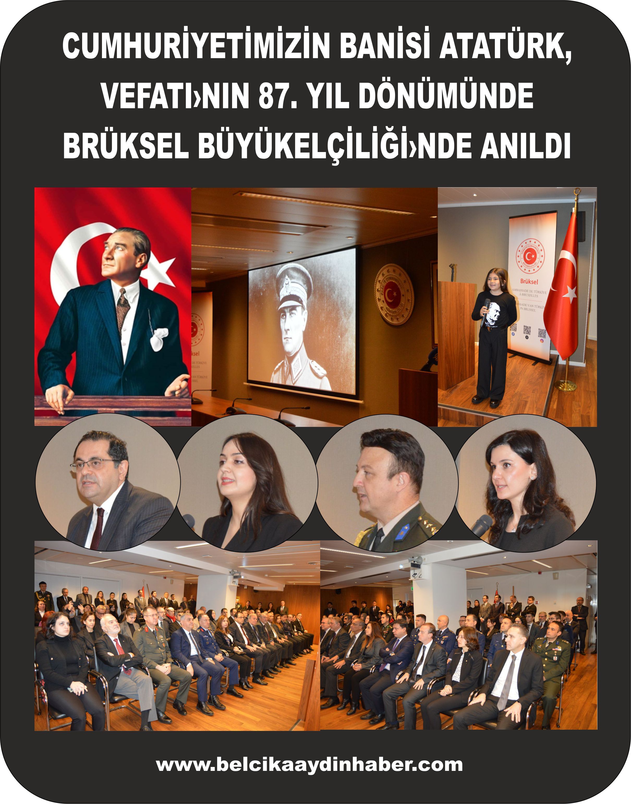 Büyük Önder Atatürk, ebediyete intikalinin 87. Yılında Türkiye Cumhuriyeti'nin kurucusu Büyük Önder Mustafa Kemal Atatürk, ebediyete intikalinin 87. yılında, Avrupa'daki temsilciliklerde törenle anıldı. Türkiye'nin Brüksel Büyükelçiliğinde Büyükelçi Barış Tantekin'in ev sahipliğinde yapılan tören, Atatürk ve silah arkadaşlarının anısına saygı duruşu ve İstiklal Marşı'yla başladı.