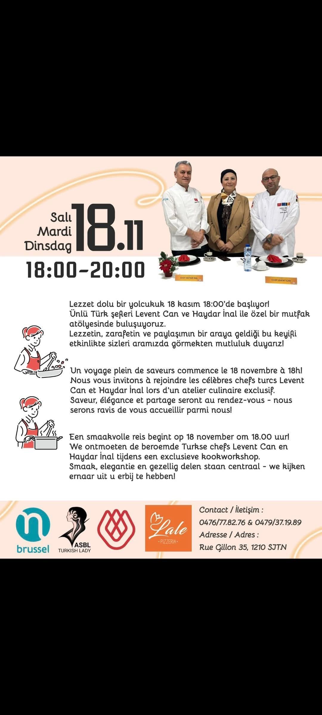 Bundan sonra haftalık olacak olan ‘Yemek Kursları’, ‘Belçika Türk Toplumu’nun Ödüllü ve Milli Şefleri Can ve İnal tarafından uygulamalı olarak Kursiyerler sunulacaktır.