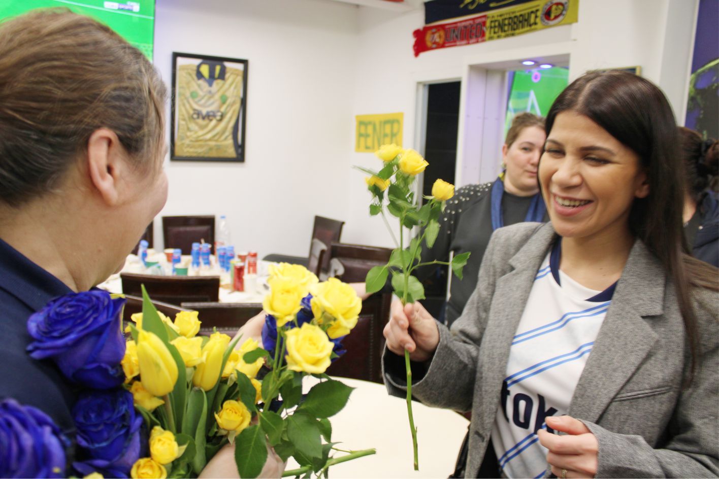 ‘8 Mart Dünya Kadınlar Günü’ nedeniyle Kadın Kolları Başkanı Ebru Alkan Manço, günün anlamı ile ilgili güzel bir konuşma yaparak, Kadın davetli ve genç kızlara sarı lacivert gül ve laleler takdim etti.