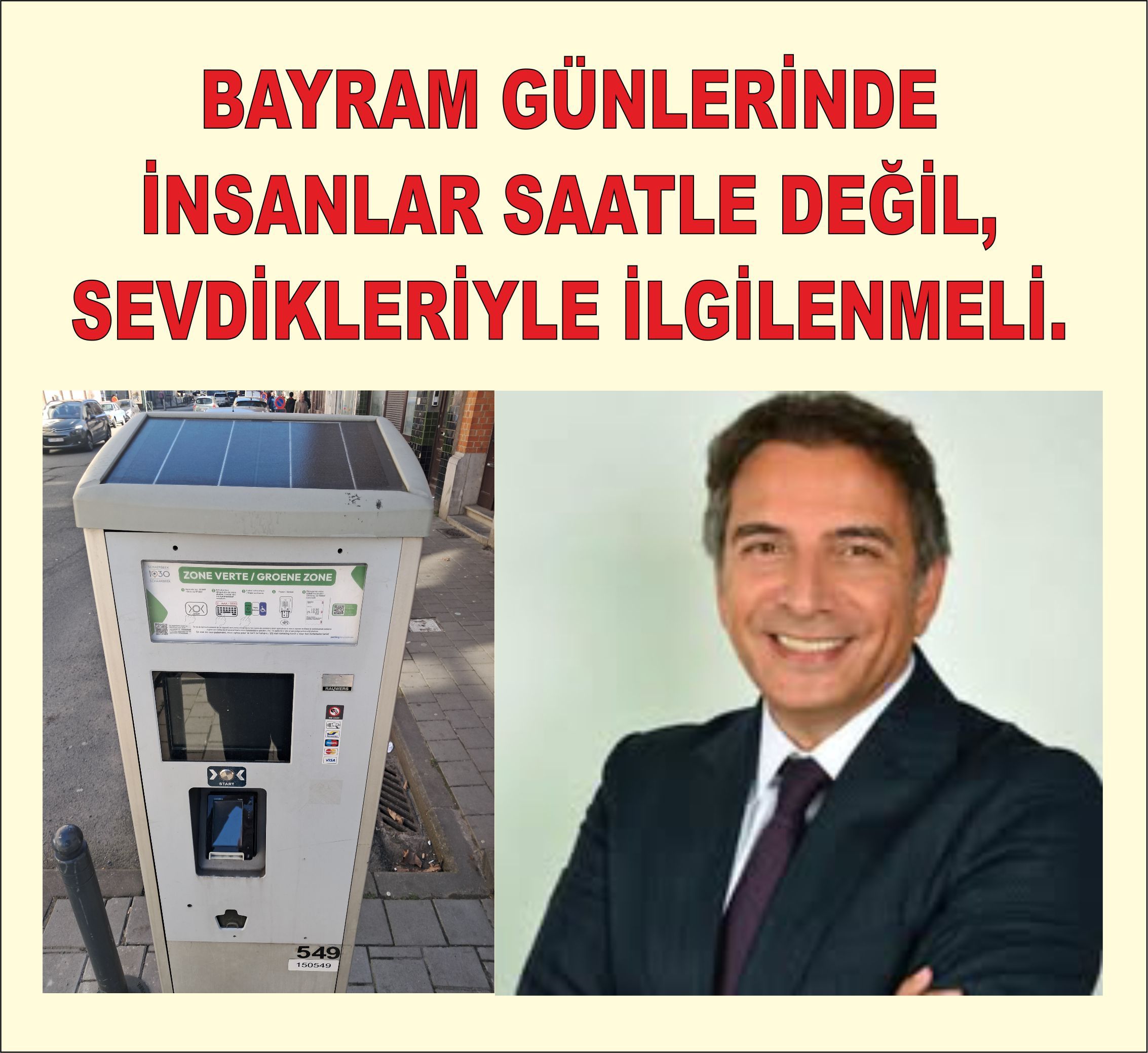 "Ramazan Bayramını inşallah bu Cuma kutlayacağız , Schaerbeek’te çok sayıda aile reislerine ziyaretler olacak, bu vesilele Belediye Başkanı ve Ulaşım ( mobilite ve park) Encümeni’ne açık bir öneride bulundum: Bu Cuma ve Cumartesi günleri park yerlerini ücretsiz yapmalarını (pazar zaten ücretsiz).