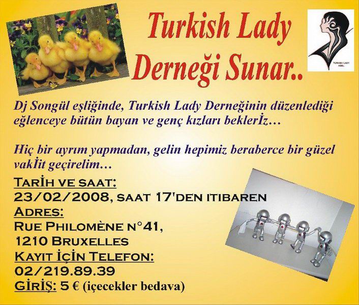 Turkish Lady Derneği Dj Songül eşliğinde dbir eğlence programı düzenliyor. Bayanların davetli olduğu eğlenceye tüm bayan ve genç kizlar katılabilir. GİrİŞ: 5 â¬uro (içecekler bedava) olduğu eğlence 23/02/2008 günü, saat 17,00' den itibaren başlayacaktır. Eğlence Rue Philomène n°41, 1210 Bruxelles adresinde yapılacaktır. Bilgi İçİn Telefon: 02/219.89.39
