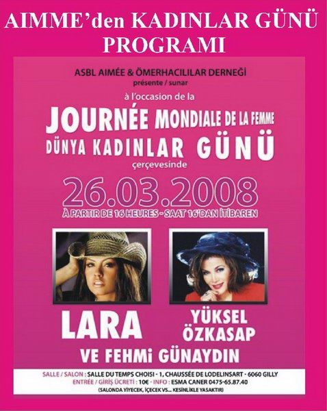AIMEE Başkanı Esma Caner âHer yıl geleneksel plarak andığımız 8 Mart Dünya Kadınlar Günü programı çerçevesinde konuşmacıların yanında Türkiyeâden ünlü sanatçılarımızıda getirerek kadınlarımızla buluşturacağız. Kadın Hakları konusundaki konuşmaların ardından güzel konserle programımız sona erecektir » dedi. AIMEE Derneğinin her yıl geleneksel olarak kutladığı âDünya Kadınlar Günüâ programı bu yıl 23-03-2008âde Salle du Temp Choisi-1 Chaussée de LODELİNSART 6060 Gilâde saat 16.00 yapılacaktır. AIMEE ve Ãmerhacılılar Derneğinin ortaklaşa sunacakları programa konuşmacıların yanında ünlü sanatçılar Lara, Yüksel Ãzkasap ve Fehmi Günaydınâda katılacaktır. Geniş bilgi için bu nımaradan bilgi alabilirsiniz Esma Caner : 0475 678 740 www.belcikahaber.be