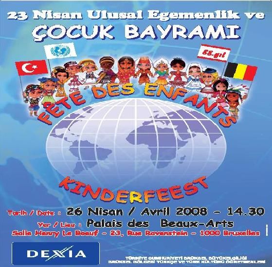 Brüksel Bölgesi Ãğretmenleri 23 Nisan kutlamasına hazırlanıyorlar.. Türkiye Cumhuriyeti Brüksel Büyükelçiliği Brüksel Bölgesi Türkçe ve Türk Kültürü Ãğretmenleri tarafından hazırlanan, 23 Nisan Ulusal Egemenlik ve Ãocuk Bayramı kutlamaları, 26 Nisan 2008 Cumartesi günü saat 14:30´da « 23 rue Ravenstein 1000 Bruxelles » adresinde bulunan Palais des Beaux-Arts´da gerçekleştirilecektir. Mustafa Ãzcan Brüksel Bölgesi Türkçe ve Türk Kültürü Ãğretmeni
