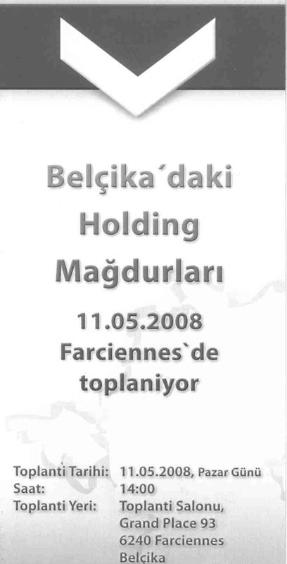 Kombassan, Yimpaş, Jetpa vs. tüm holding mağdurları 11 mayıs pazar günü Farciennes'de toplanıyor. Avrupa'nın çeşitli kentlerinde açılan davalar sonucu bir çok dava kazanılmıştır. Yatırılan paralar mahkemeler yoluyla holdinglerden geri alınmıştır. Bu konuda Belçika'daki hukuki mevzuatı açıklamak ve hukuki bilgi alışverişinde bulunabilmek için uzman avukatlar Ãmit Akca ve Ãzkan Arıkan'ın da bulunacağı bir toplantı yapılacaktır. Saat 14:00'de Grande Palace 93 6240'da yapılacak toplantıyla ilgili olarak, 0049 2302707750'den bi,lgi alınabilinir. www.belcikahaber.be