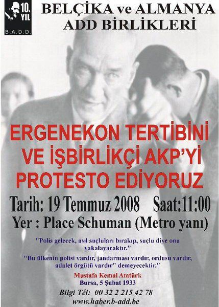Belçika Atatürkçü Düşünce Derneği ve Almanya Atatürkçü Düşünce Dernekleri Birliği 19/07/2008 Cumartesi günü saat 11'de Türkiye'de 'Ergenekon' operasyonu adı altında yapılan hukuk dışı tutuklamalar