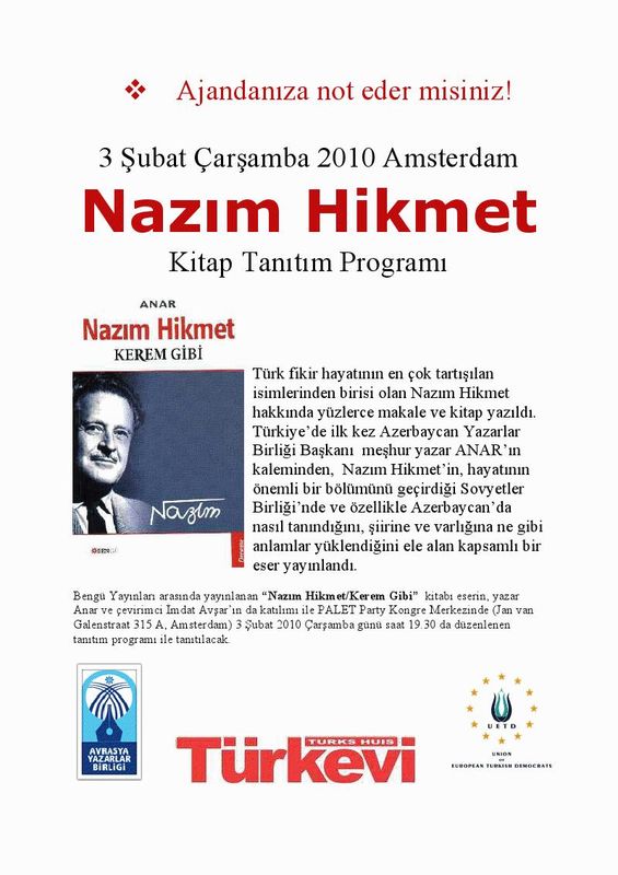 Kısa adı UETD olan Avrupalı Türk Demokratlar Birliği Hollanda şubesince Nazım Hikmeti konu alan bir kitabın tanıtımı yapılacağı bildirildi. Azerbaycan Yazarlar Birliği Başkanı olan Azerbaycan'ın ünlü şair ve edebiyatçısı Anar Rızayev'in kaleme aldığı 'Nazım Hikmet/ Kerem Gibi' adlı eserin tanıtımı yapıldı.