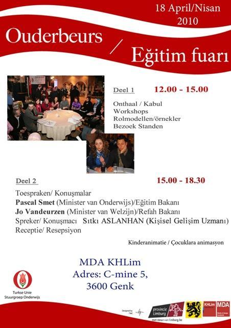 18 Nisan 2010 Pazar Günü Belçika Türk Dernekleri Birliği Eğitim Çalışma Grubu olarak 2 Eğitim fuarımızı düzenliyoruz. Bu fuarda katılanları Belçika’daki eğitim sistemi hakkında bilgilendirmek istiyoruz.