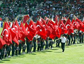 Atatürk Stadyumu'nda yapılan kutlamalarda miniklerin gösterileri, ellerinde Türk bayraklarıyla tribünleri dolduranlar tarafından da büyük ilgiyle izledi. Sıcak bir havada yapılan bayram kutlamalarına katılanlar güneşten korunmaya çalıştı. Bazı çocuklar ise, kısa süreli baygınlık geçirdi.