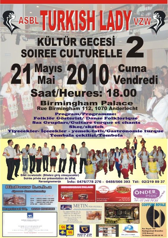 Turkish Lady´nin geçen yıl ilkini düzenlediği ´Kültür Gecesi´´nin bu yıl ikincisini Birmingham Palace 112, 1070 Anderlecht´te düzenlenecektir.
