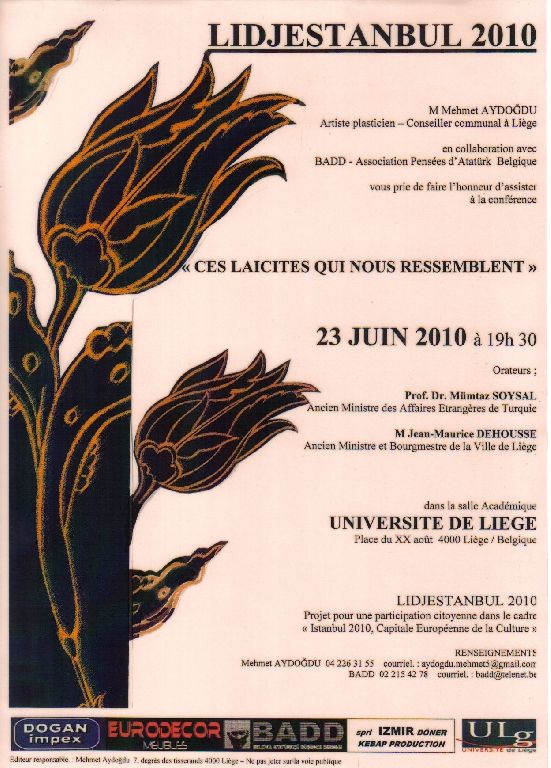 Liege Belediyesi Kültürden sorumlu meclis üyesi, Sanatçı Mehmet AYDOGDU tarafindan gerçekleştirilen LIDJESTANBUL 2010 projesi kapsamında düzenledigi,Belçika ADD ve Liege Universitesinin katkı larıyla düzenlenecek konferansa katılımınızdan onur duyarız.