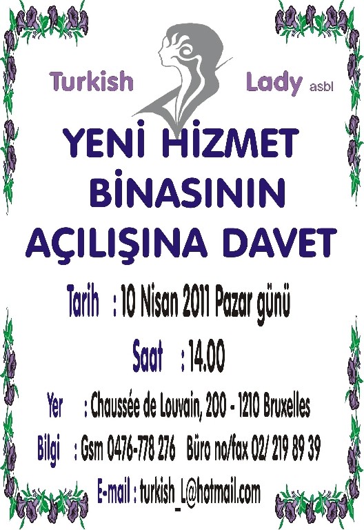 Brüksel'de hizmet veren Turkish Lady Derneği Chaussée de Lovain, 200 - 1210 Schaerbeek'deki yeni hizmet binasının açılışı bugün saat: 14.00'de yapılmakta.