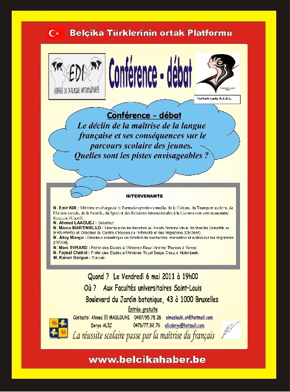 L'association "Espace de Dialogue Interculturel - E.D.I. asbl" en partenariat avec l'association "Turkish Lady asbl" ont le plaisir de vous convier à la conférence-débat qui aura lieu le vendredi 6 mai 2011 à 19h aux Facultés universitaires Saint-Louis, boulevard du Jardin botanique 43 à 1000 Bruxelles, et qui a pour thème :