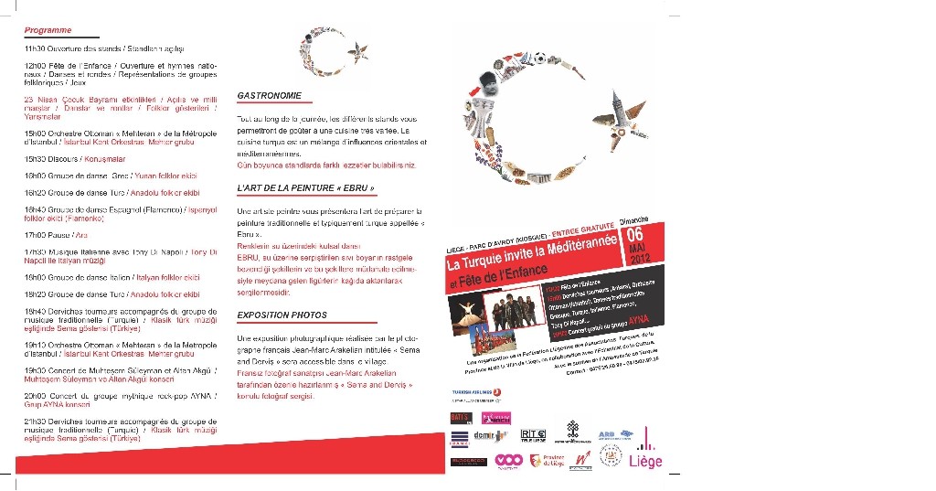 Tüm gün boyunca, çeşitli etkinliklerin sergileneceği festival « Türkiye, Akdeniz ülkelerini ağırlıyor » teması ile gerçekleşecektir. Bu kapsamda festival boyunca, Akdeniz ülkelerini temsil eden (Yunan, İspanyol, İtalyan) gruplar çeşitli kültürel gösterilerde bulunacaklardır. Liège Belediyesi desteği ve ev sahipliğinde gerçekleştirilecek festival, TC. Kültür ve Turizm Bakanliğı tarafından da desteklenmektedir. İçeriğinde çok çeşitli kültürel etkinliklerin yeralacağı festivalde, Istanbul büyükşehir Belediyesi Kent Orkestrası Mehteran Grubu, Klasik Türk Müziği Topluluğu (Ankara) gibi gruplar gün boyunca gösteri yapacaklardır.