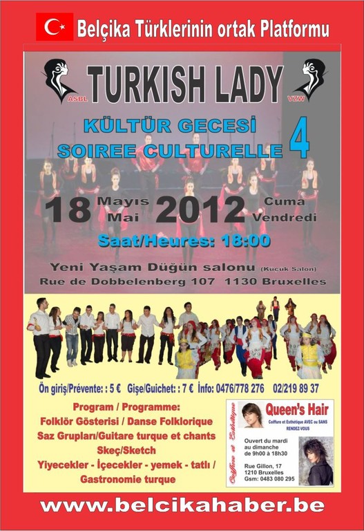 Rue Du Dobbelenberg,107-1130 Bruxelles Yeni Yaşam Düğün (küçük) salonunda 18 Mayıs 2012 Cuma günü saat 18.00 de düzenlenecek olan Kültür Gecesi, yerel sanatçılar sahne alacaktır. Tombala çekilişininde yapılacağı gecede başarılı kursiyerlere diplomalarıda verilecektir. Programla ilgili olarak, geniş bilgi telefonları: