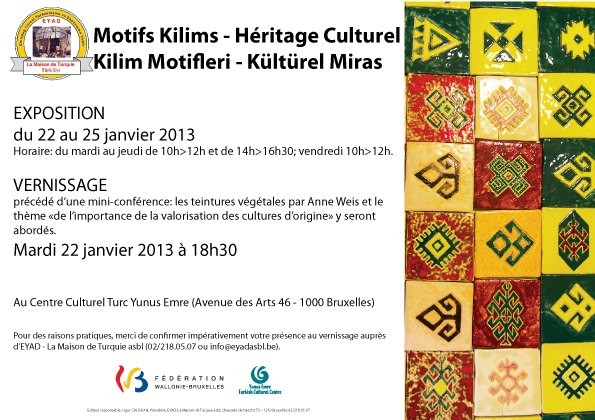 Kısa adı EYAD olan Emirdağlılar ve Yöresi yardımlaşma ve Dayanışma Derneği'nin Yunus Emre Kültür Merkezi'nde organize edeceği 'Kilim motifleri- Kültürel Miras' adlı etkinlik bu gün (22 Ocak 2013) saat 18:30'da başlayacaktır.
