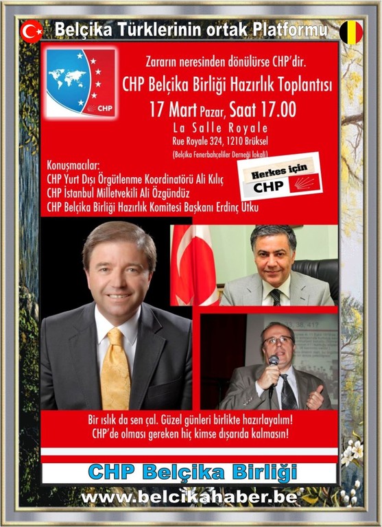 17 Mart Pazar günü saat 17.00’de “Rue Royale 324 1210 Brüksel” adresinde bulunan “La Salle Royale”da (Belçika Fenerbahçeliler Derneği lokali) yapılacak olan toplantıya tüm CHP dostlarının davetli olduğu bildirildi.