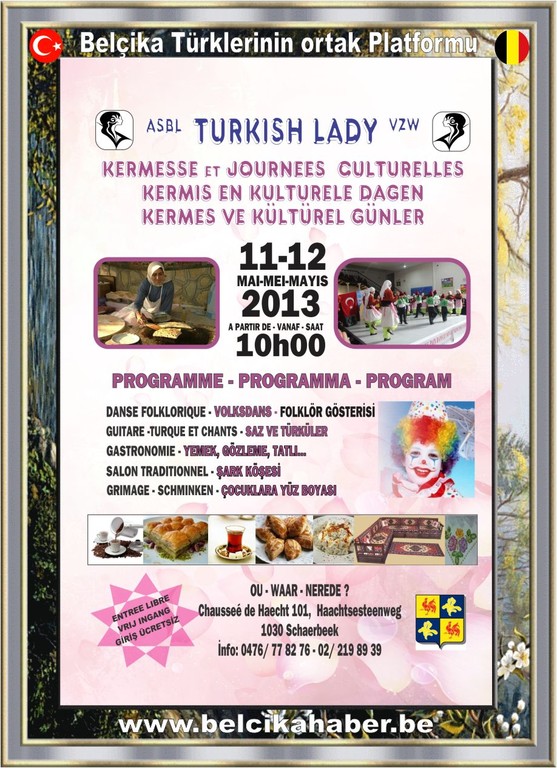 Turkish Lady Derneği'nin her yıl geleneksel olarak düzenlediği 'Kermes ve Kültürel Günleri' 11-12 Mayıs 2013 cumartesi ve pazar günleri, Chaussee de Haehct 101, 1030 numarada her sabah saat 10:00'dan, 21:00'e kadar sürecektir.