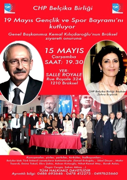 CHP Genel Başkanı Kemal Kılıçdaroğlu aynı zamanda Belçika’da CHP, Belçika Birliği üyeleri ile de bir araya gelecek. CHP Belçika Birliği Başkanı Zehra Eryörük’ün Genel Başkan Kılıçdaroğlu’nun ziyareti hakkında yaptığı duyuruda.’’Genel Başkanımız Kemal Kılıçdaroğlu'nun Brüksel ziyareti onuruna Brüksel'de 19 Mayıs Gençlik ve Spor Bayramı'nı kutlayarak unutturulmak istenen Cumhuriyet değerlerine sahip çıkıyoruz.