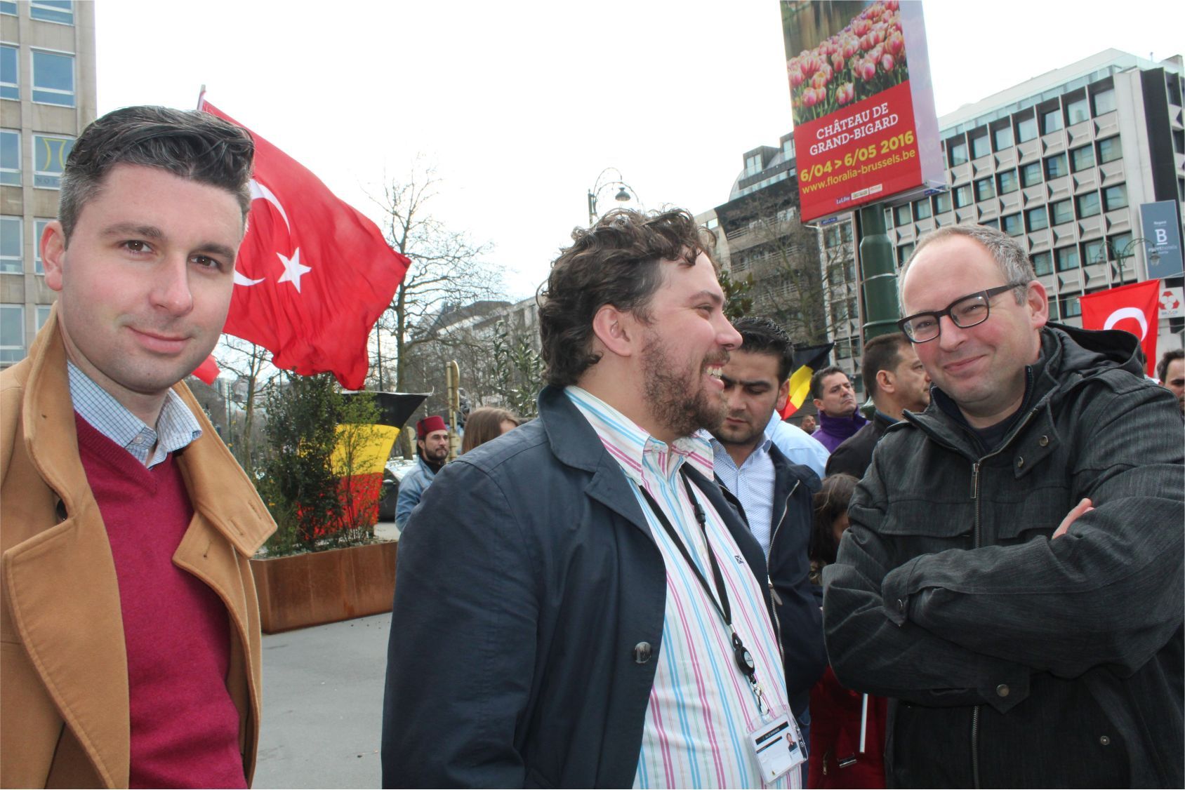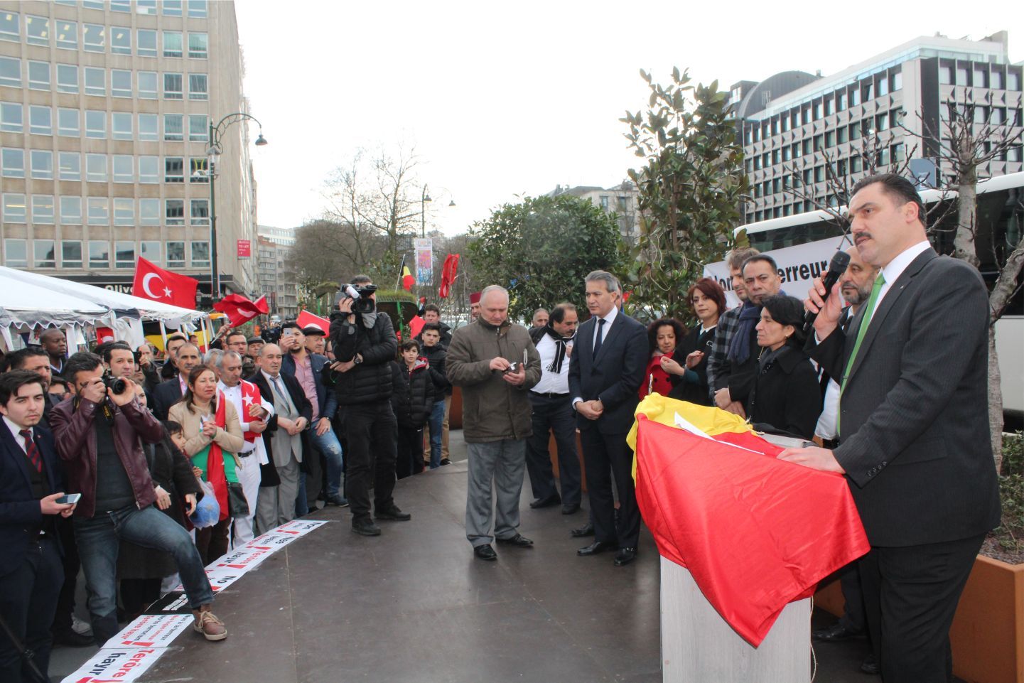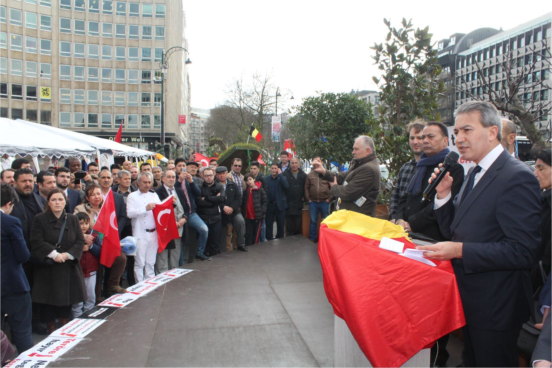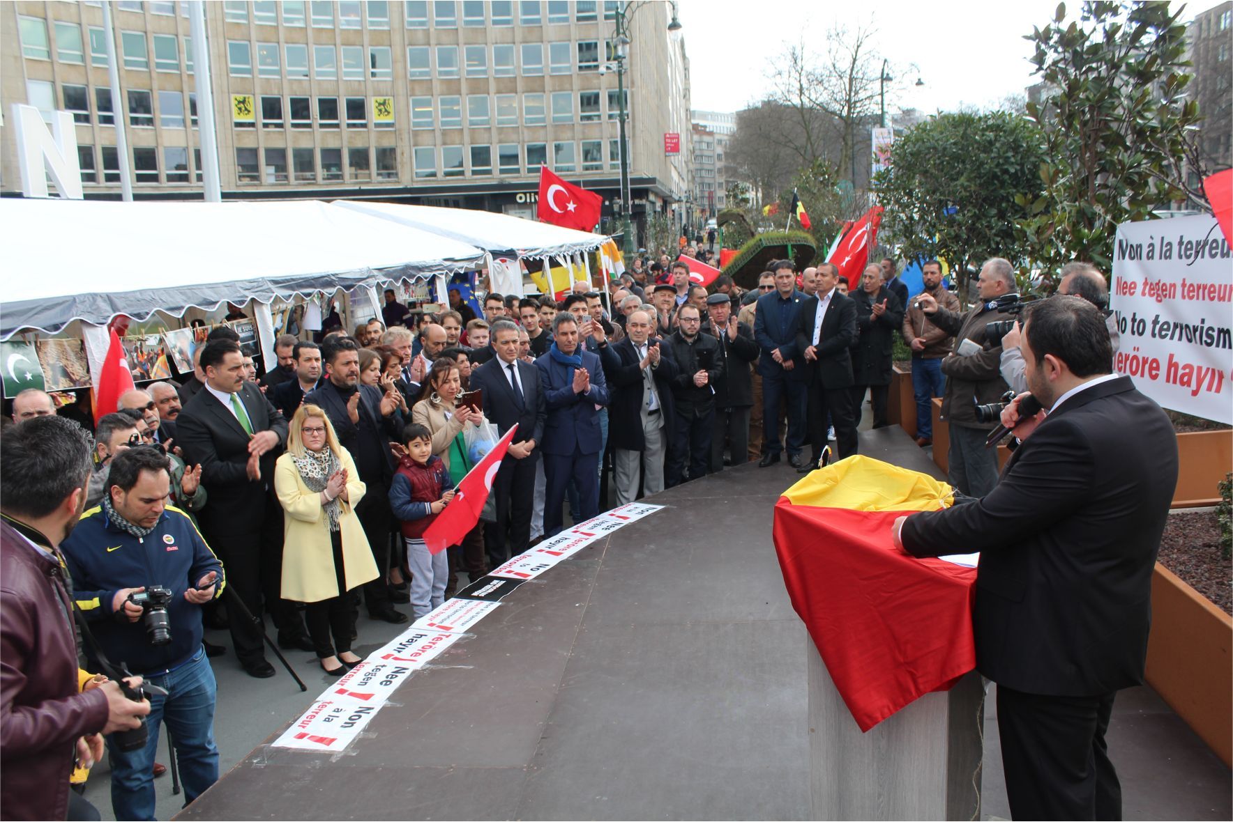 Duygulu anların yaşandığı Saint Josse Belediye Başkanı Emir Kır, Genk Belediye Başkan Yardımcısı Ali Çağlar ile UETD Belçika Şube Başkanı Basir Hamarat, teröü kınayan birer konuşma yaptılar.
