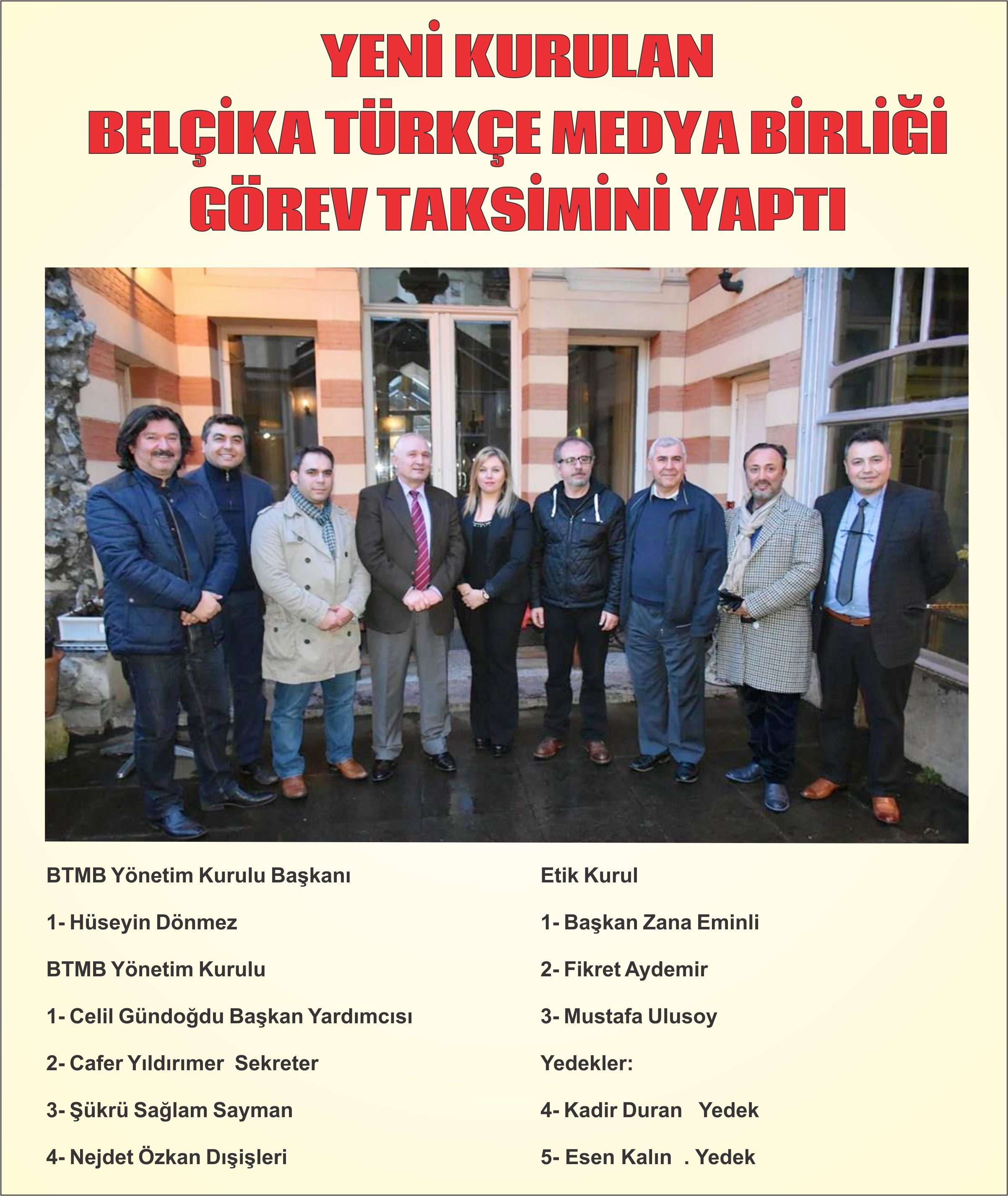 Yeni kurulan ve görev taksimatı yapıla 'Belçika Türkçe Medya Birliği' yönetim kurulunu tebrik eder, çalışmalarında başarılar dileriz.