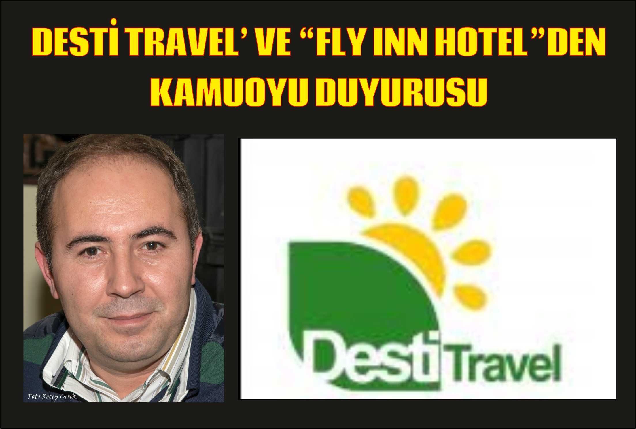25 Yıldan beri vatandaşlarımızın büyük teveccühü ile hizmet verdiğimiz 'Desti Travel' ve 'Fly Inn Hotel' adlı şirketlerimize yönelik sosyal medya ve bazı basın organlarında yayınlanan olumsuz ve karalamaya yönelik saldırı ve haksızlıklara karşılık gönderdiğimiz kamuoyu mesajını yayınlamanızı rica ederim, dilekleriyle haber merkezimize gönderilen kamuoyu bildirisini sizlerle paylaşıyoruz..