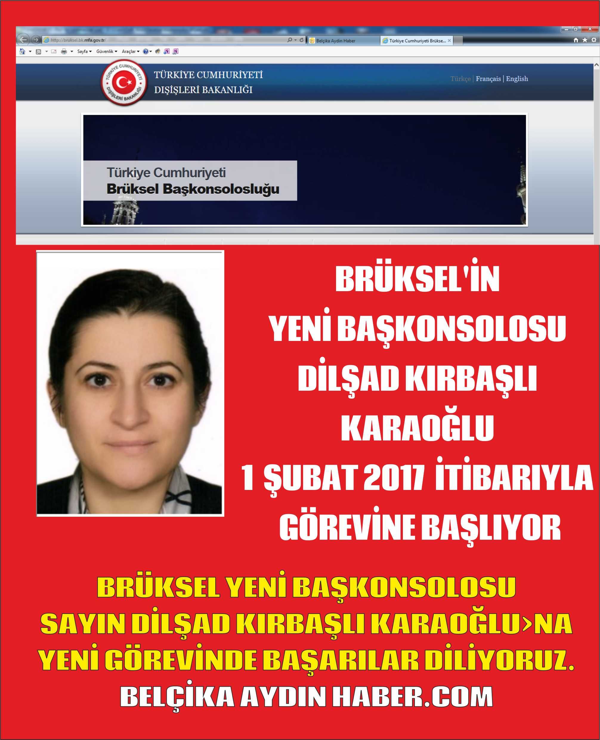Yeni Brüksel Başkonsolosu Dilşad Kırbaşlı Karaoğlu, geçtiğimiz günlerde Belçika'ya gelerek, görevinden ahiren ayrılan Ali Barış Ulusoy'un yerine, 1 Şubat 2017 tarihinde görevine başlıyoı. BRÜKSEL YENİ BAŞKONSOLOSU SAYIN DİLŞAD KIRBAŞLI KARAOĞLU"ºNA YENİ GÖREVİNDE BAŞARILAR DİLİYORUZ. BELÇİKA AYDIN HABER.COM