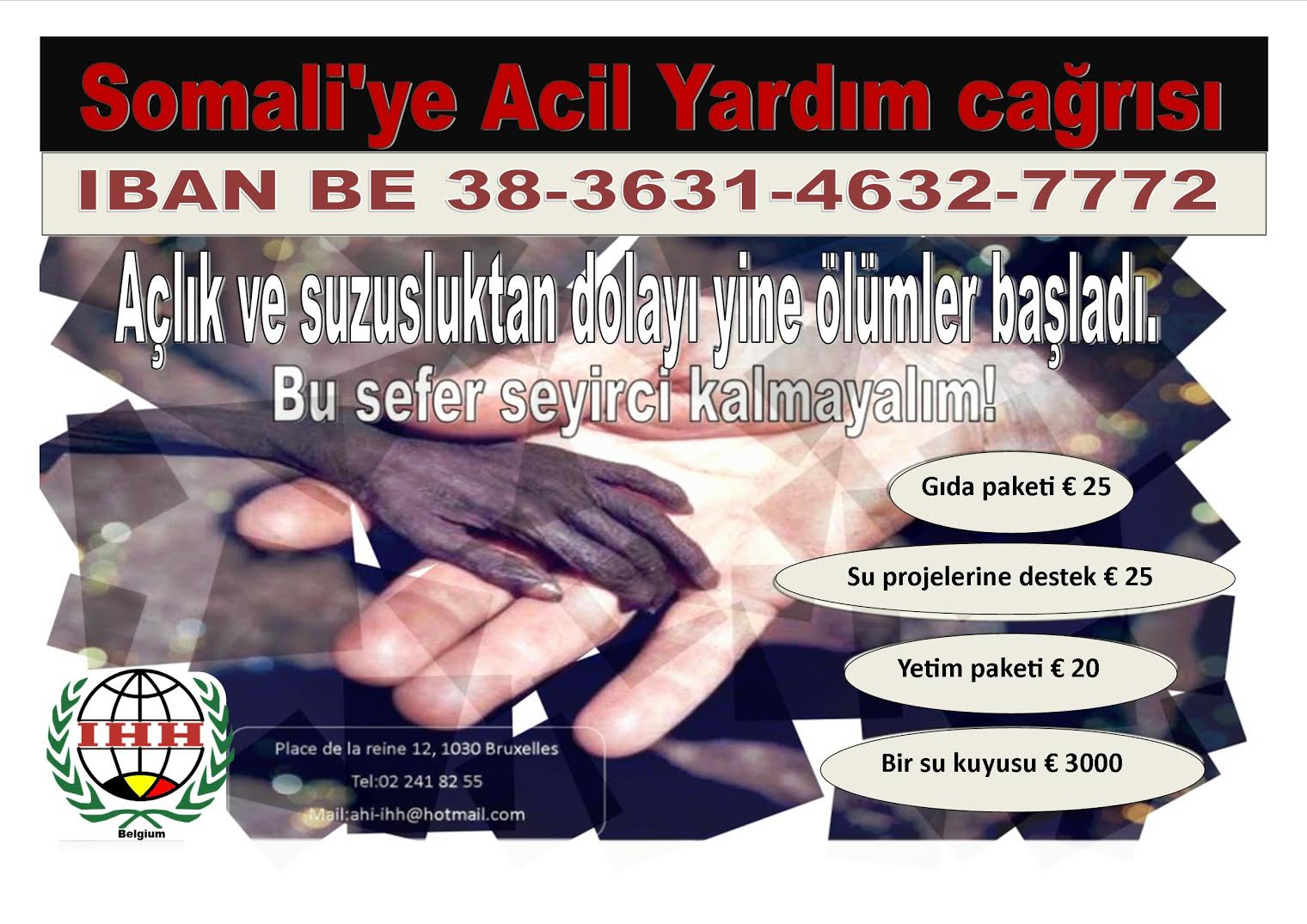 Yardımda bulumak isteyen vatandaşlarımız ister hsaba yatırabilirler veya bşzatihi Butomuza gecip makbuz karşılığında yardılarını yapa bilirler. Belcika İHH hesap No: İban: BE 38 3631 4632 7772